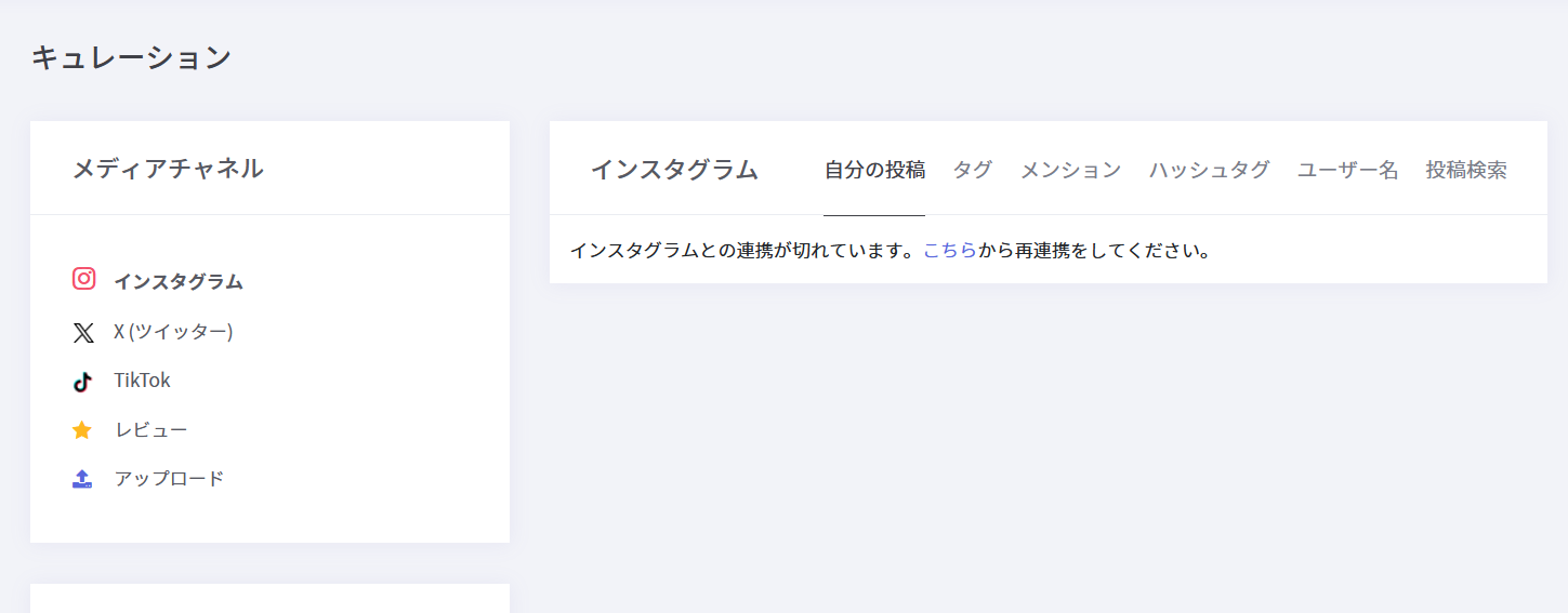 「インスタグラムとの連携が切れています。こちらから再連携をしてください。」と表示されているときは、「U-KOMIとfacebookアカウントの連携」の手順にそって、instagram連携を解除し、再連携を行ってください。