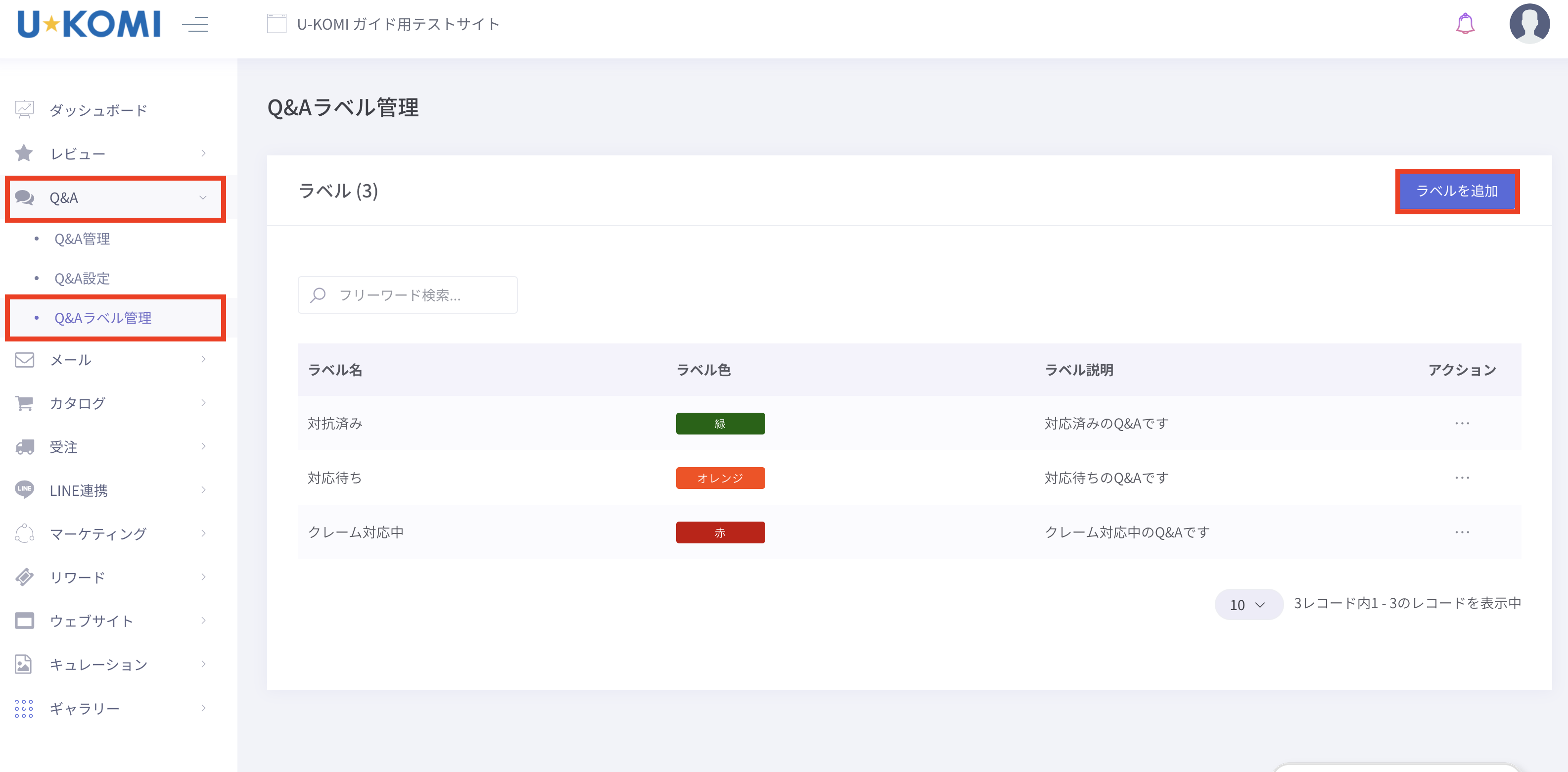 Q&Aにラベルを追加するにはU-KOMI管理画面の【Q&A】→【Q&Aラベル管理】をクリックします。