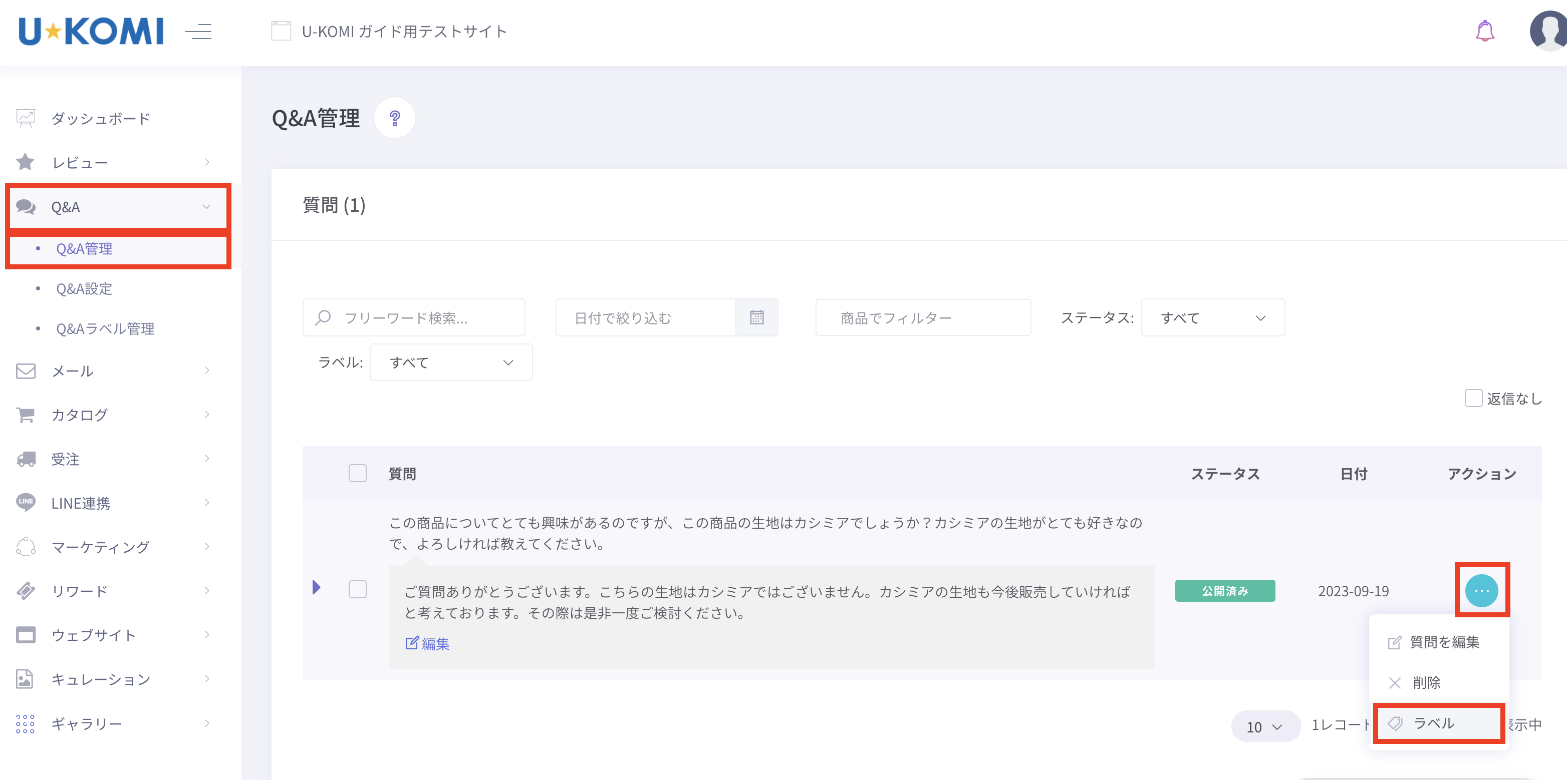 追加したラベルをレビューに設定するにはU-KOMI管理画面のQ&A】→【Q&A管理】をクリックし、各Q&A左端にある【…】をクリックすると、アクションニューが出てきますので、一番下の【ラベル】をクリックします。
