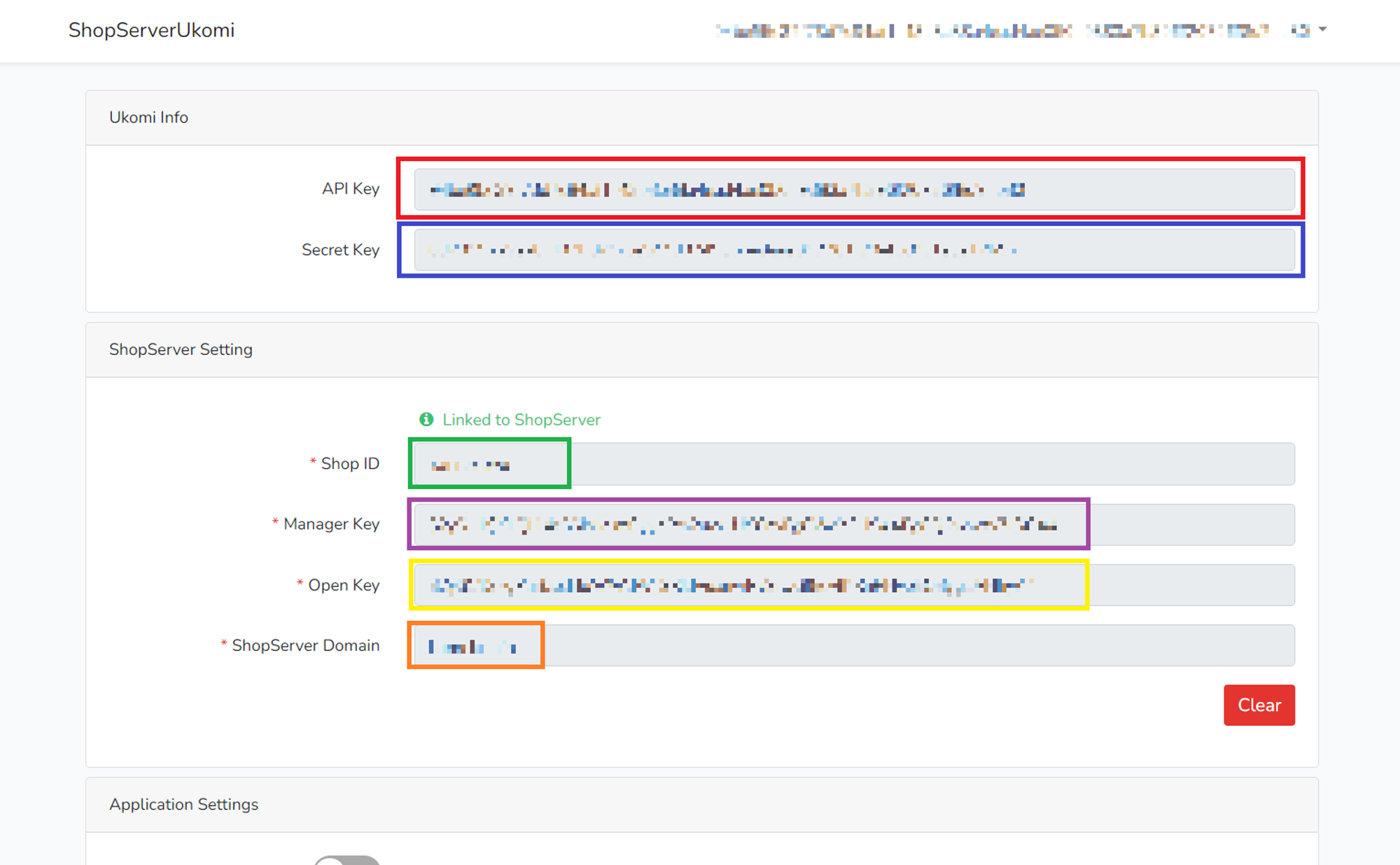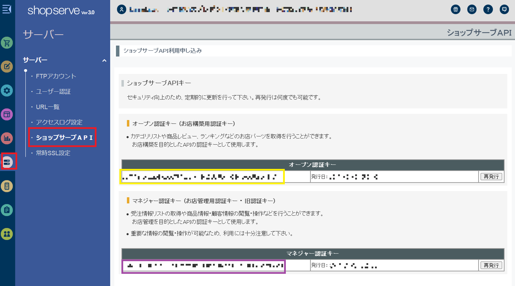 Manager KeyはShopServe管理画面【サーバー】→【ショップサーブAPI】をクリックし、表示されている【マネジャー認証キー】の左側(紫枠)を使用します。 Open Keyは上記と同様の場所にある【マネジャー認証キー】の上に表示されている【オープン認証キー】の左側(黄枠)を使用します。