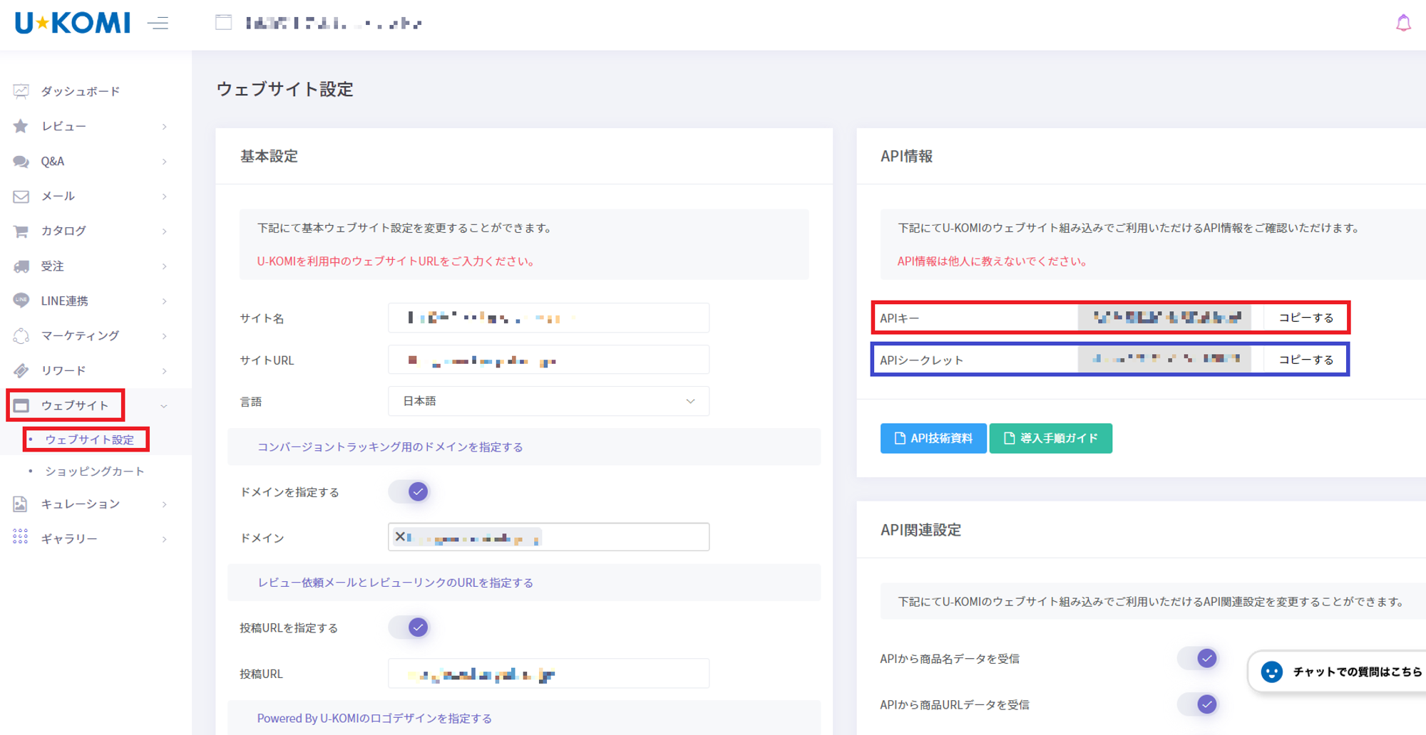 画像右側の赤四角と青四角がU-KOMI管理画面のAPIキー、APIシークレットが表示されている場所です