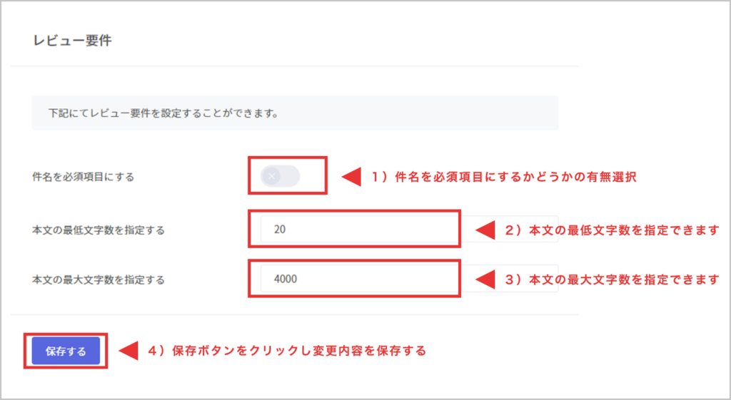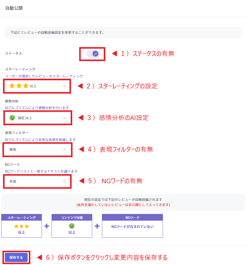 星の数(最大5個)以上のレビューを公開させる設定が可能です。
