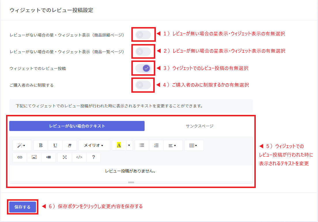 ウィジェットでのレビュー投稿が行われた時に表示されるテキストを変更することができます。