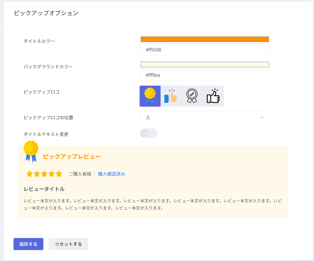 レビューのタイトルを変更できます(デフォルトはピックアップレビュー)