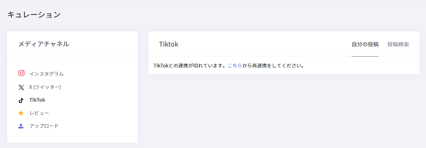 「TikTokとの連携が切れています。こちらから再連携をしてください。」と表示されているときは、「Tik Tokの連携方法」の手順にそって、TikTok連携を解除し、再連携を行ってください。