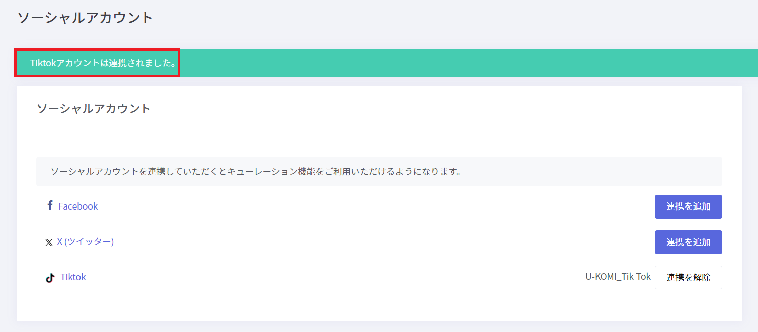 U-KOMI管理画面に自動的に戻りまして「TikTokアカウントは連携されました。」と表示されましたら連携が完了となります。