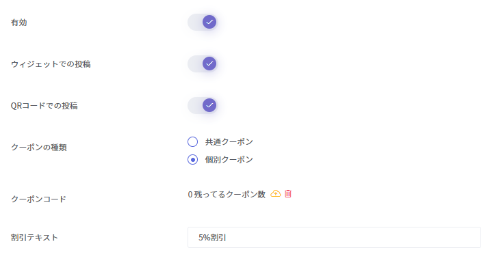 QRコードからのレビュー投稿で、クーポンの配布をするかどうか設定できます。