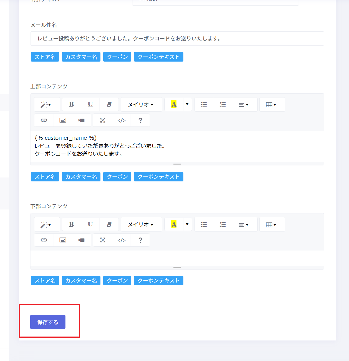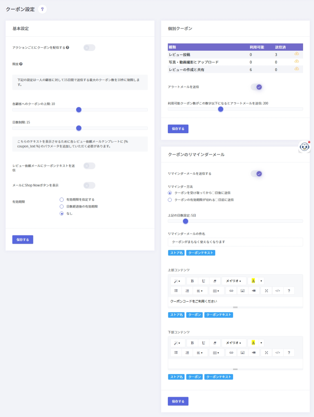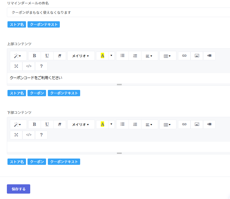 クーポンのリマインダーメールのテンプレートを設定できます。