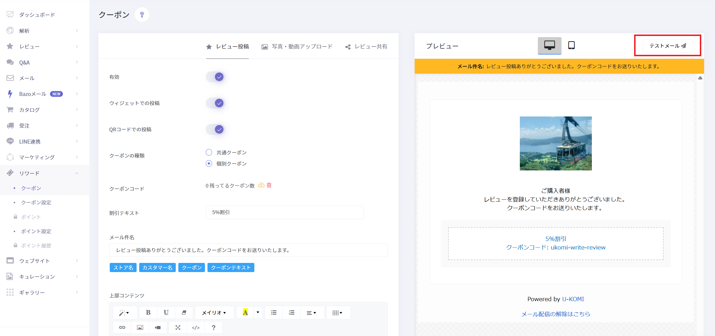 レビュー依頼メールからのレビュー投稿で、クーポンを配布するかどうか設定できます。