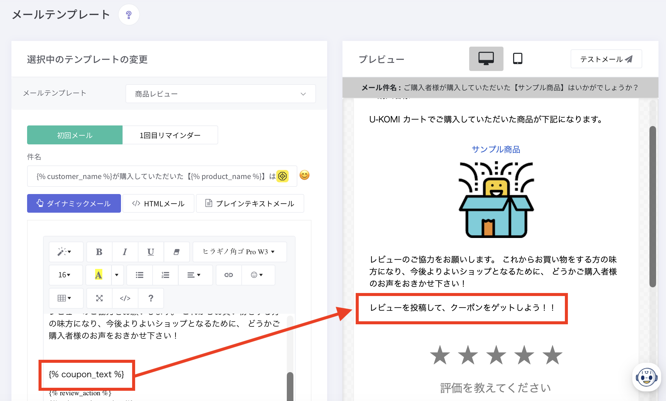 テキストを表示させるためには、各レビュー依頼メールのテンプレートに