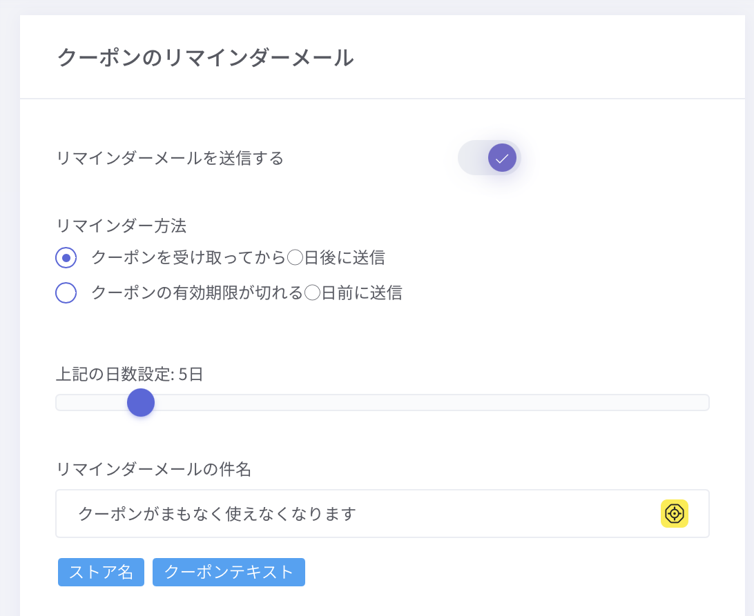 お客様に対して送信する、クーポンの有効期限のリマインダーメールの設定ができます。
