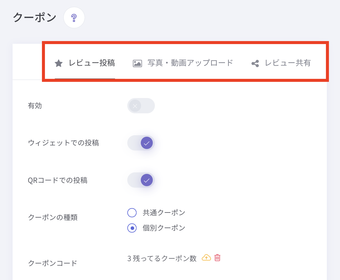 アクションごと( レビュー投稿 / 写真・動画アップロード / レビュー共有 )にクーポンを配布するかを設定できます。