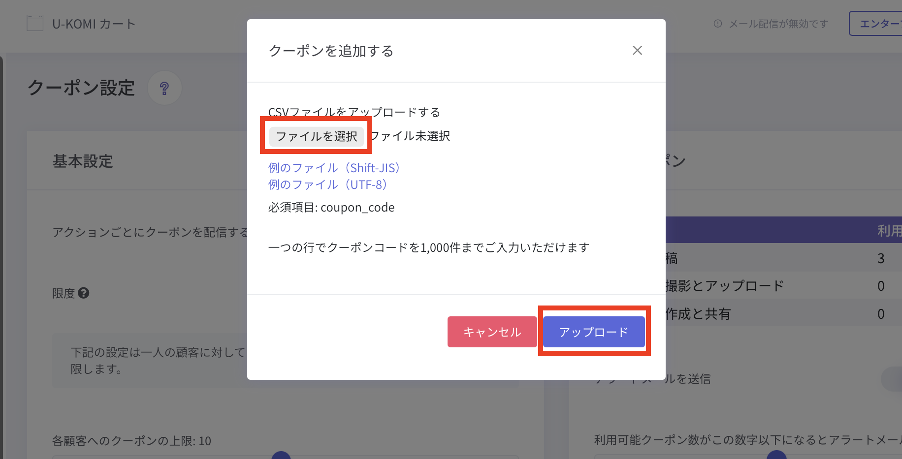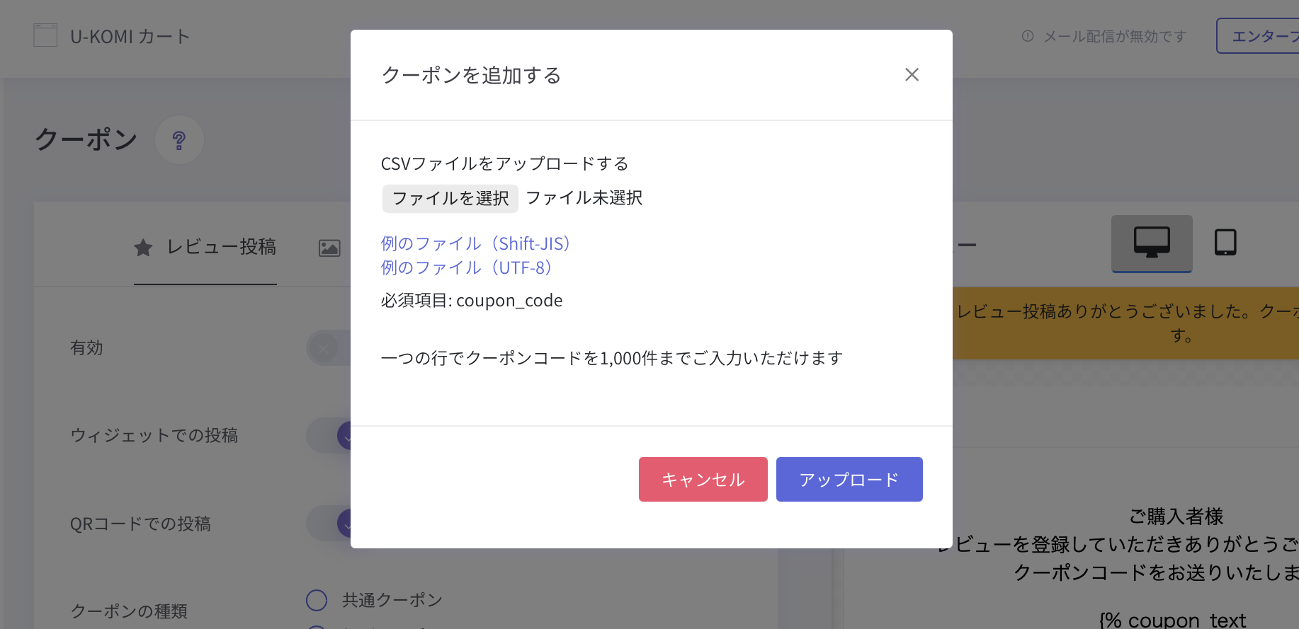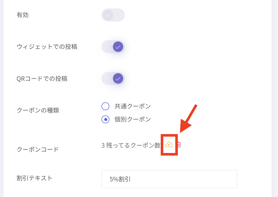 残ってるクーポン数の右側にある雲マークを押すと、CSVアップロード画面が表示されます。