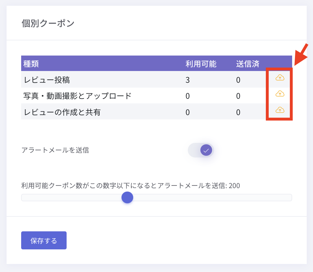 個別クーポンの残数や配布数を確認したり、クーポンの残数に応じてアラートメールを送信する設定ができます。