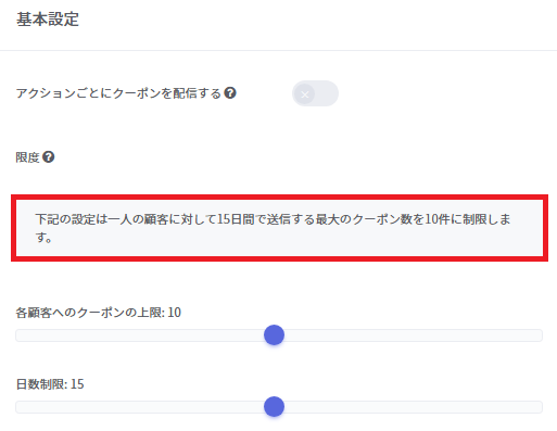 「 各顧客へのクーポンの上限 」「 日数制限 」がどちらも0の場合は、