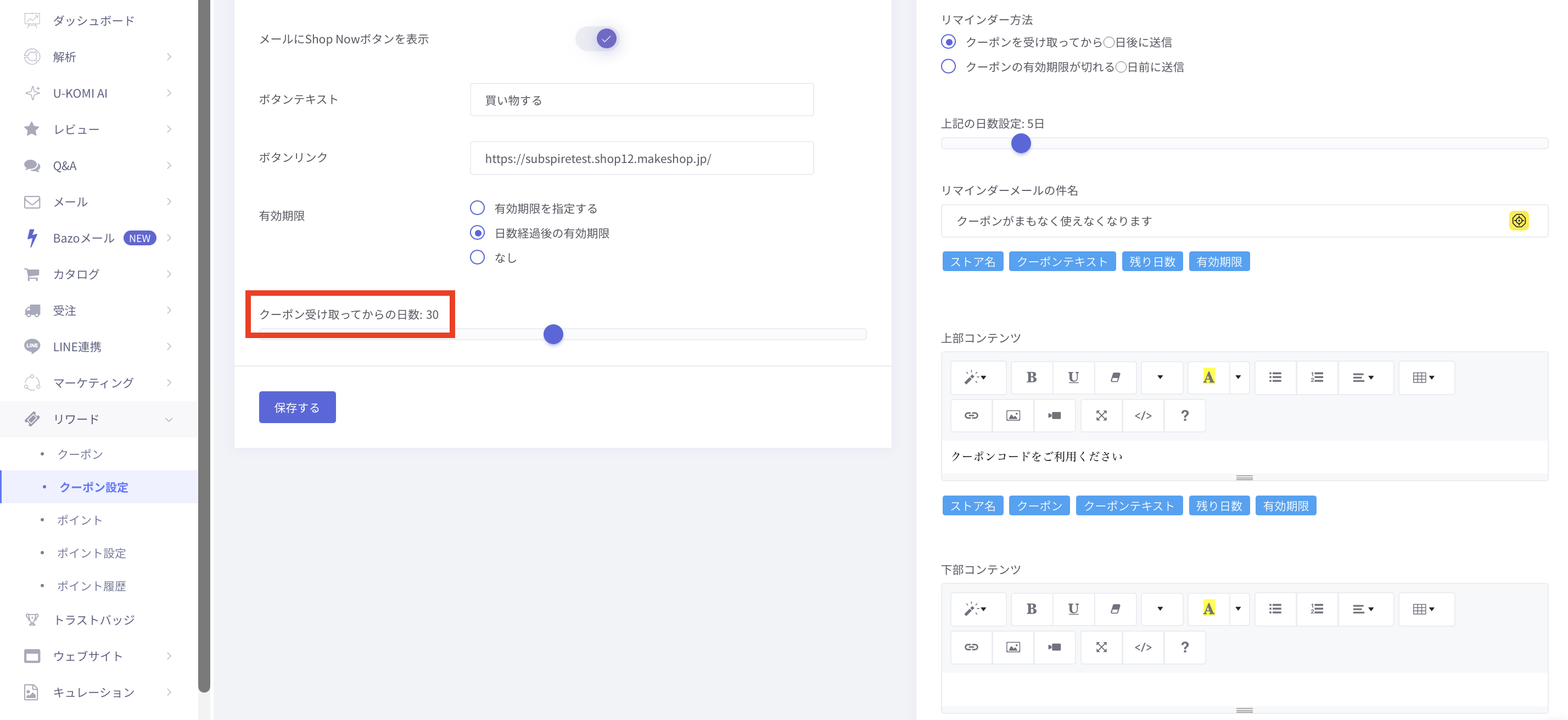 「 リワード > クーポン設定 > 有効期限 」より、クーポンメールに記載する有効期限を設定できます。