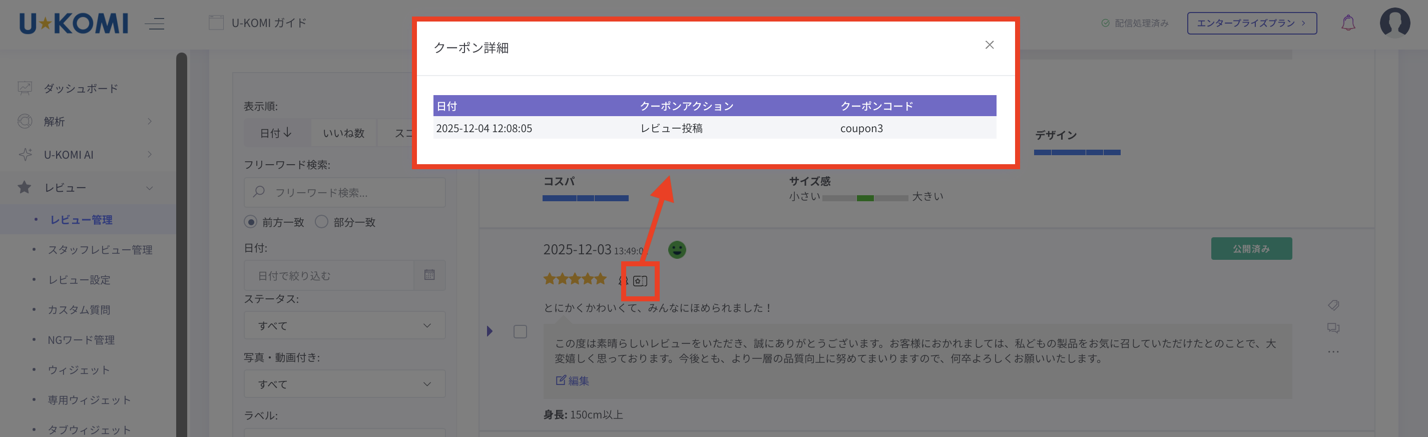 クーポンが発行されたレビューには、「 レビュー > レビュー管理 」の星評価の右に「クーポン配布済みマーク」が表示されます。