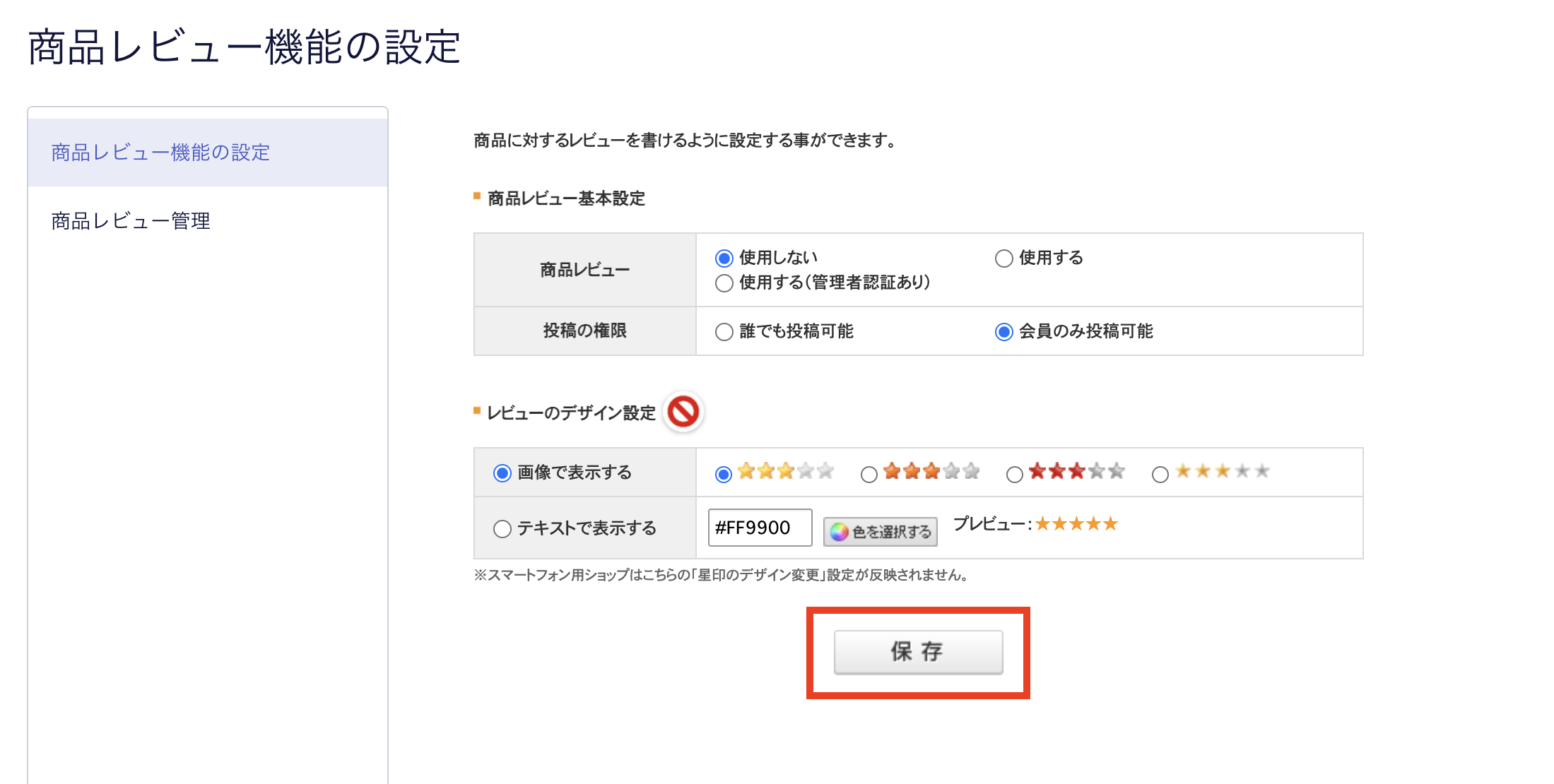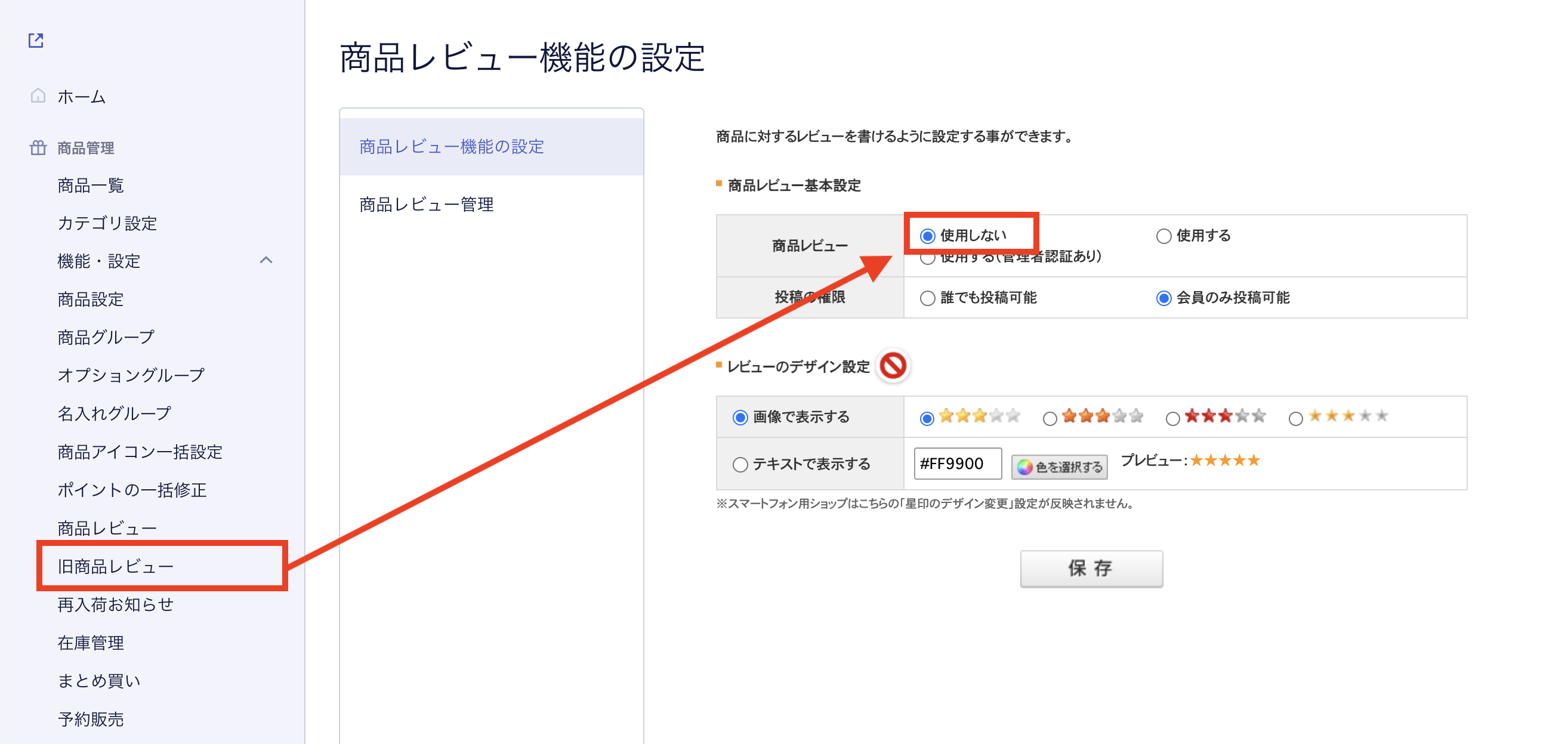 makeshopの既存レビュー機能を無効化するmakeshop管理画面の「商品管理>機能・設定>旧商品レビュー>商品レビュー機能の設定」から無効化することができます。①商品レビューを「使用しない」にチェックを入れます。② 保存 を押したら完了です。