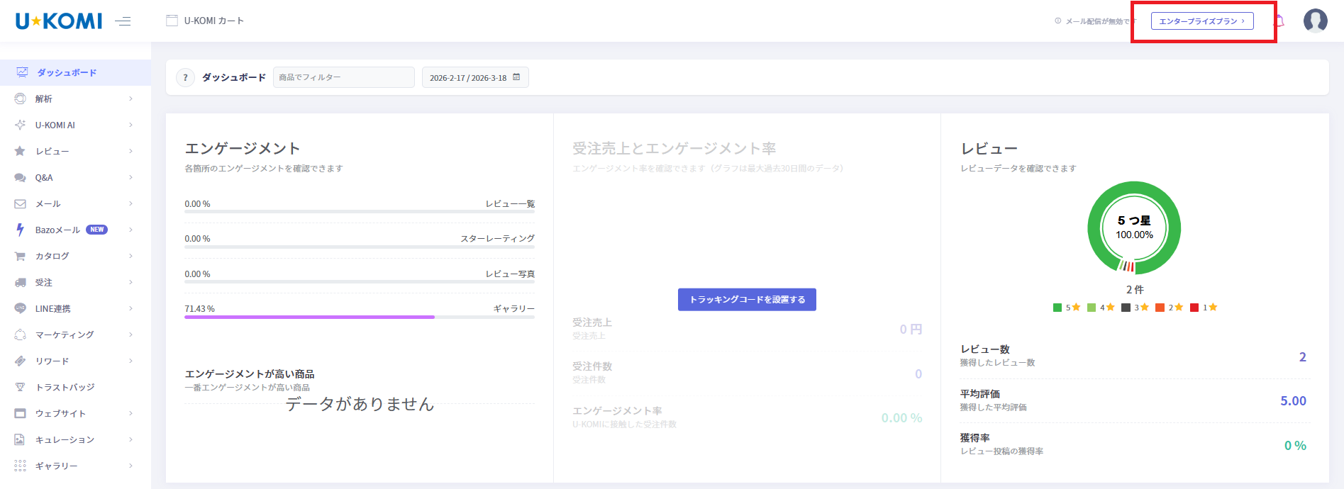 U-KOMI管理画面右上から プランページ(プラン名タブ) を押し、ご希望のプランを選択してください。