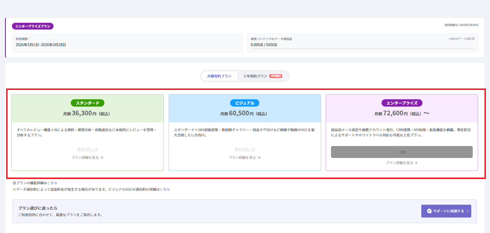 フリープランへの変更や、他の上位プランへの変更はできません。