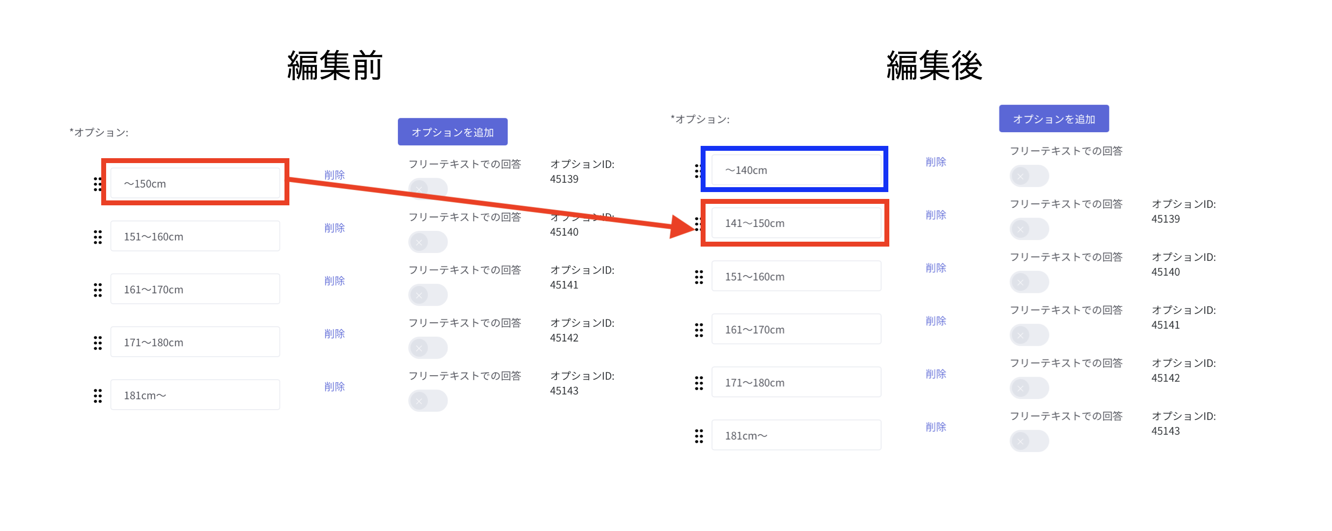 「 〜150cm 」を「 141~150cm 」に変更し、新たに「 〜140cm 」という選択肢を追加した場合