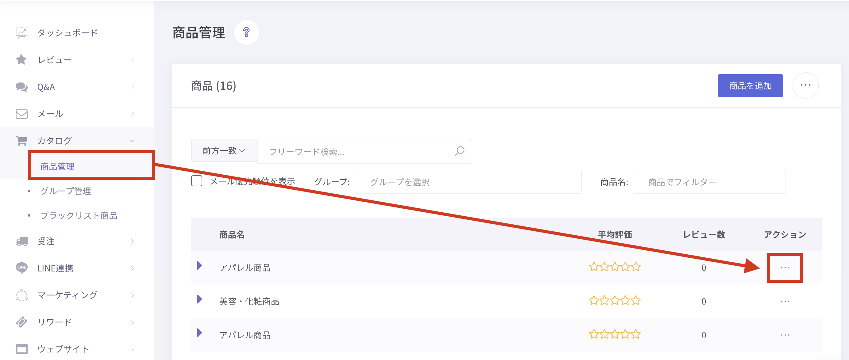 ①「カタログ > 商品管理 」より、タグを追加したい商品のアクションボタン(…)を選択します。