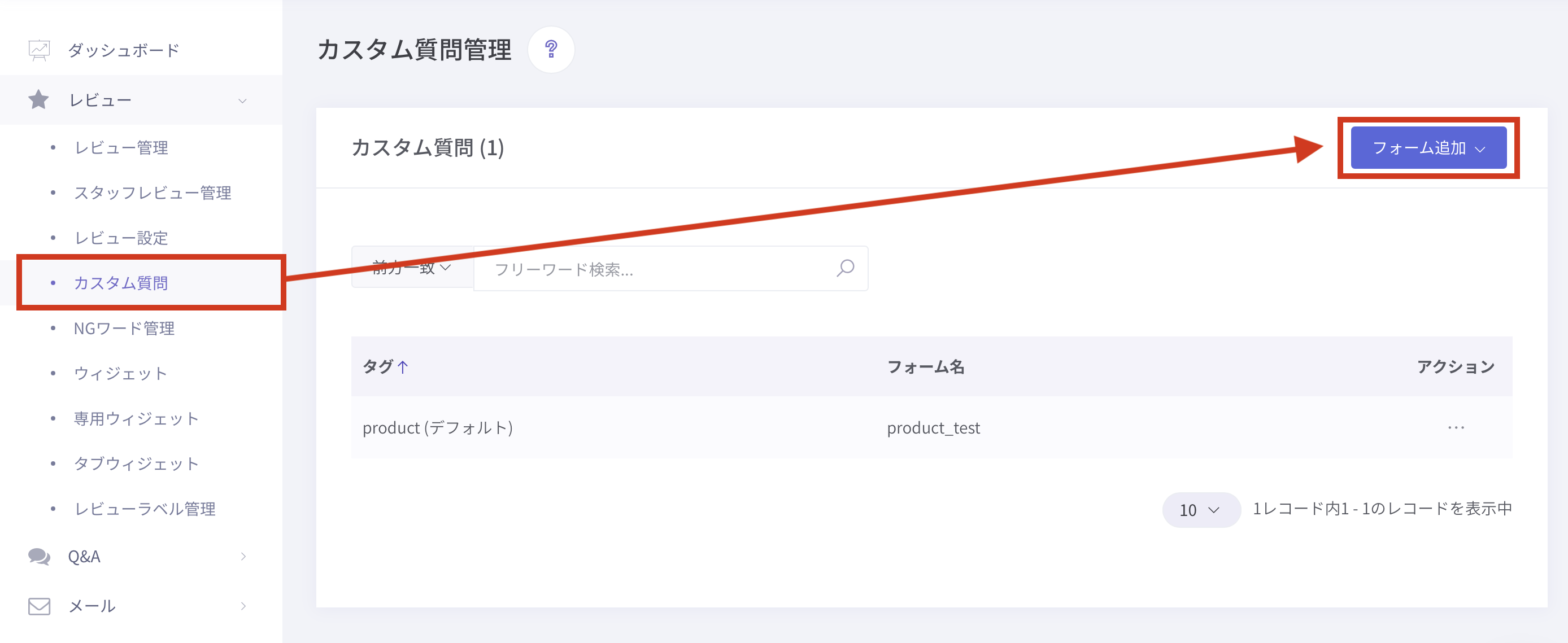 ① 「レビュー > カスタム質問 」より、フォーム追加 をクリックします。