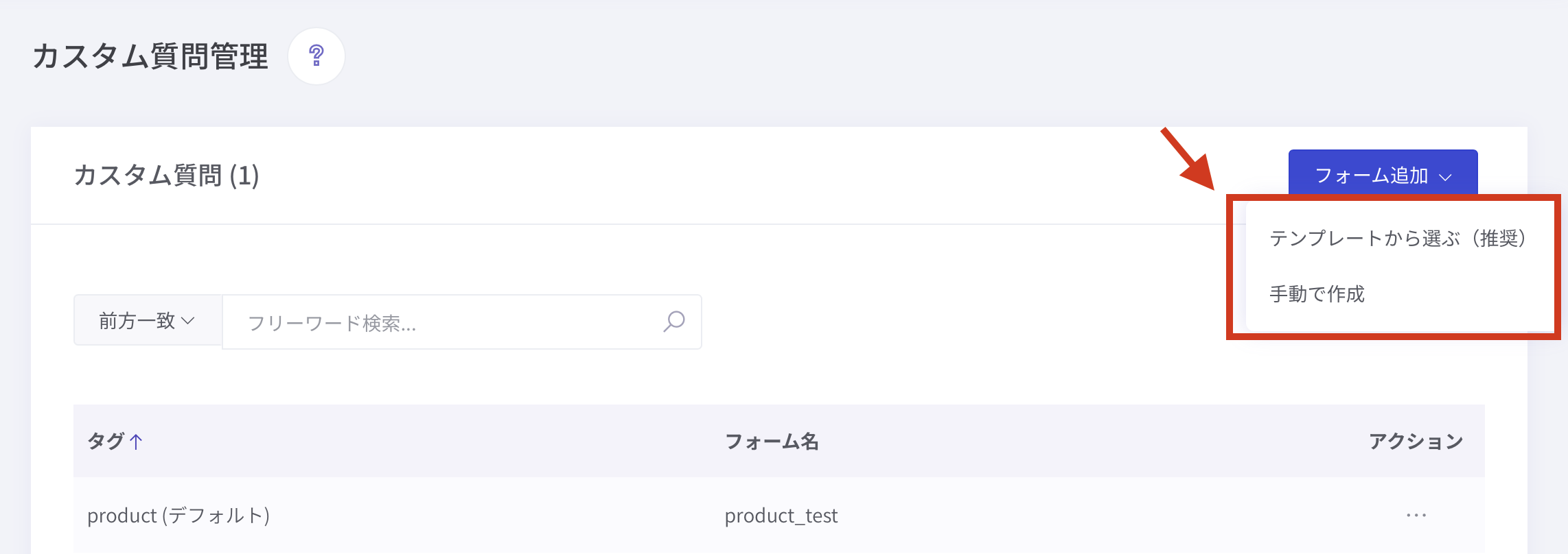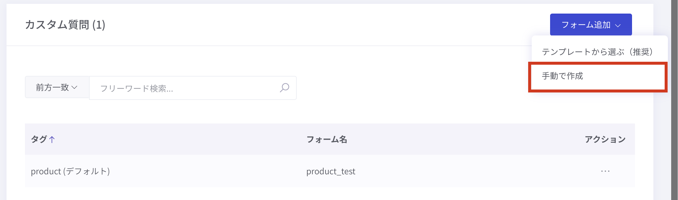 ①「フォーム追加 > 手動で作成 」を押すと、カスタム質問フォームの追加ページが表示されます。