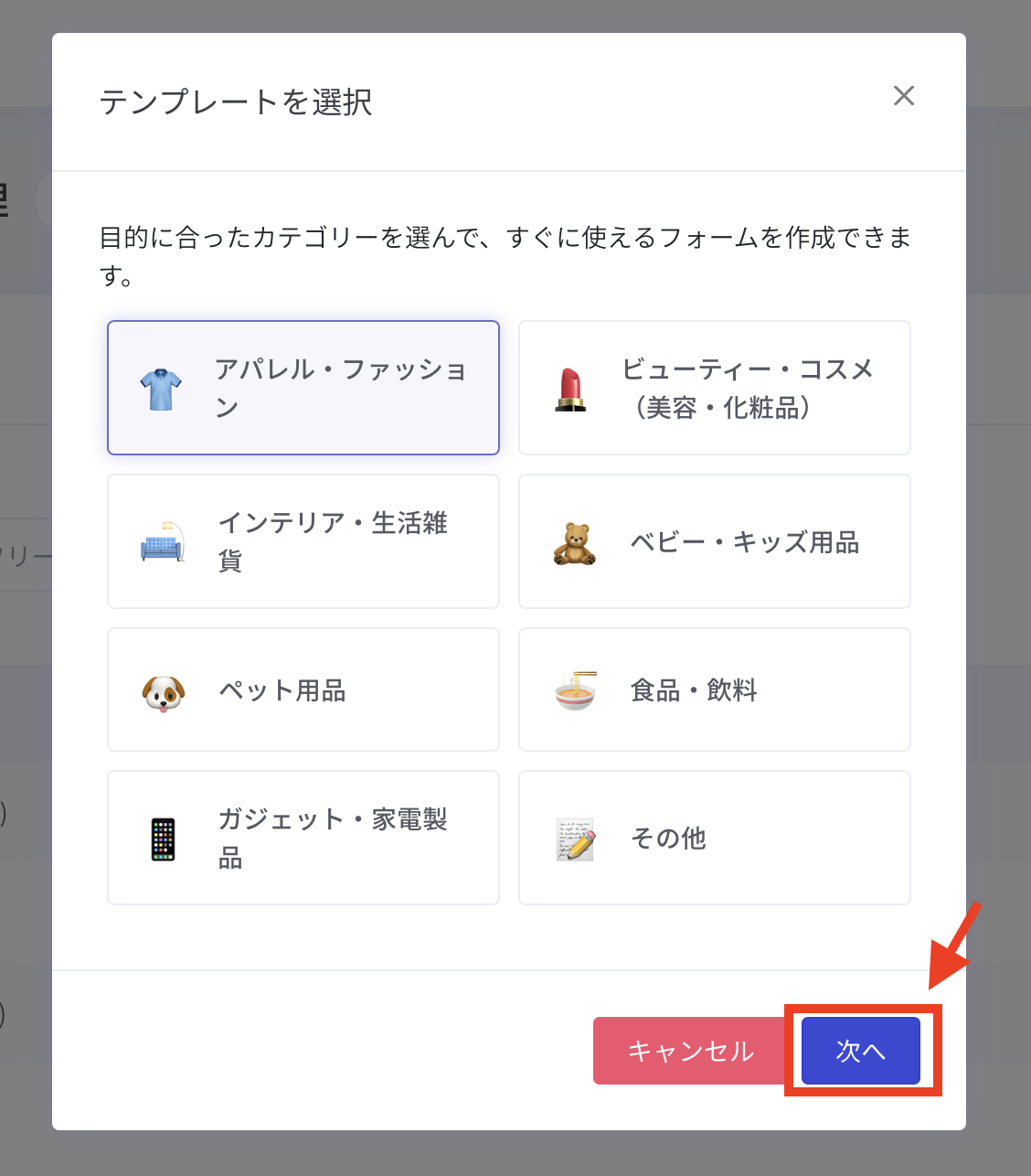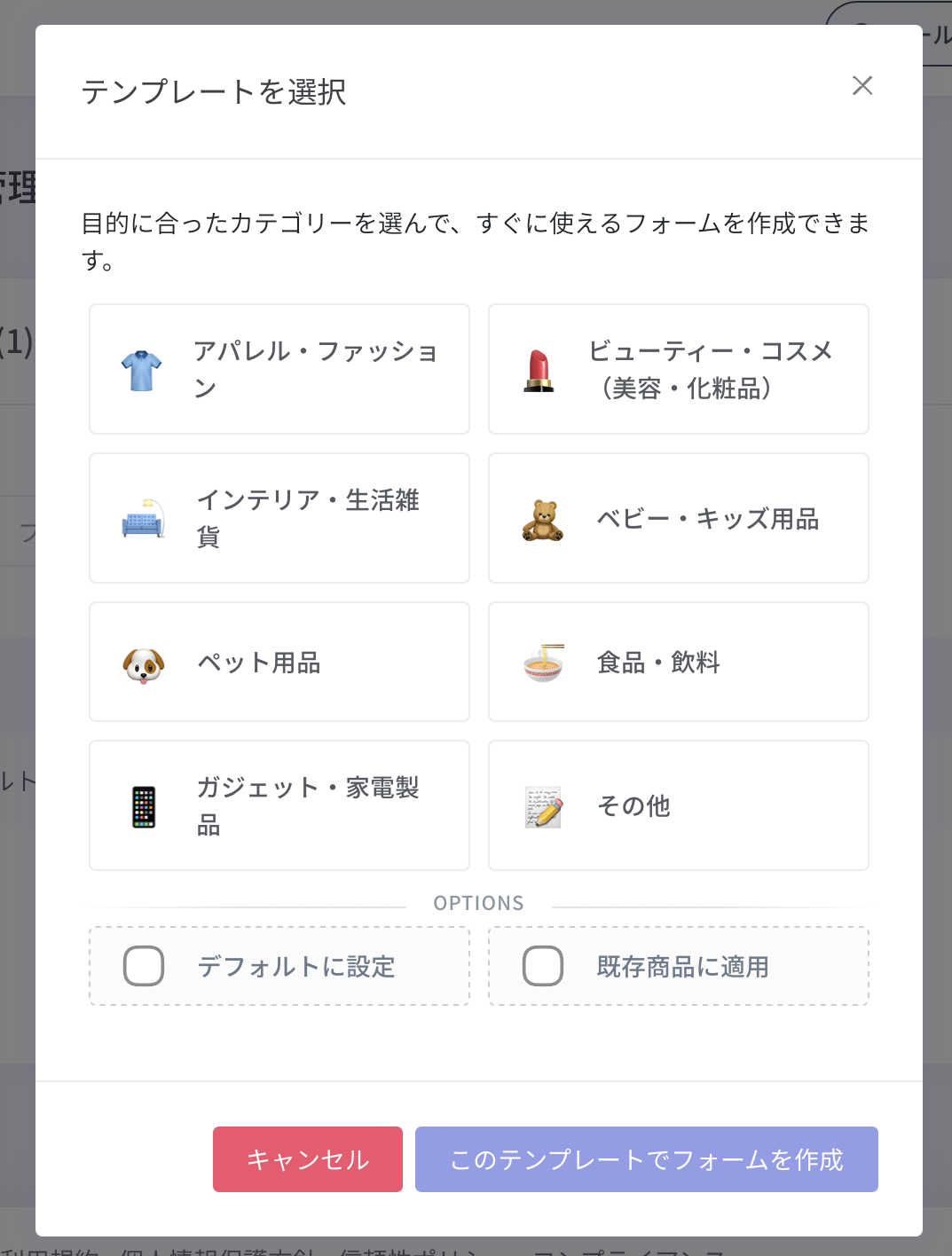 ①「フォーム追加 > テンプレートから選ぶ 」を押すと、テンプレートの選択画面が表示されますので、商品のカテゴリーに最も近いものを選択し、このテンプレートでフォームを作成 を押します。