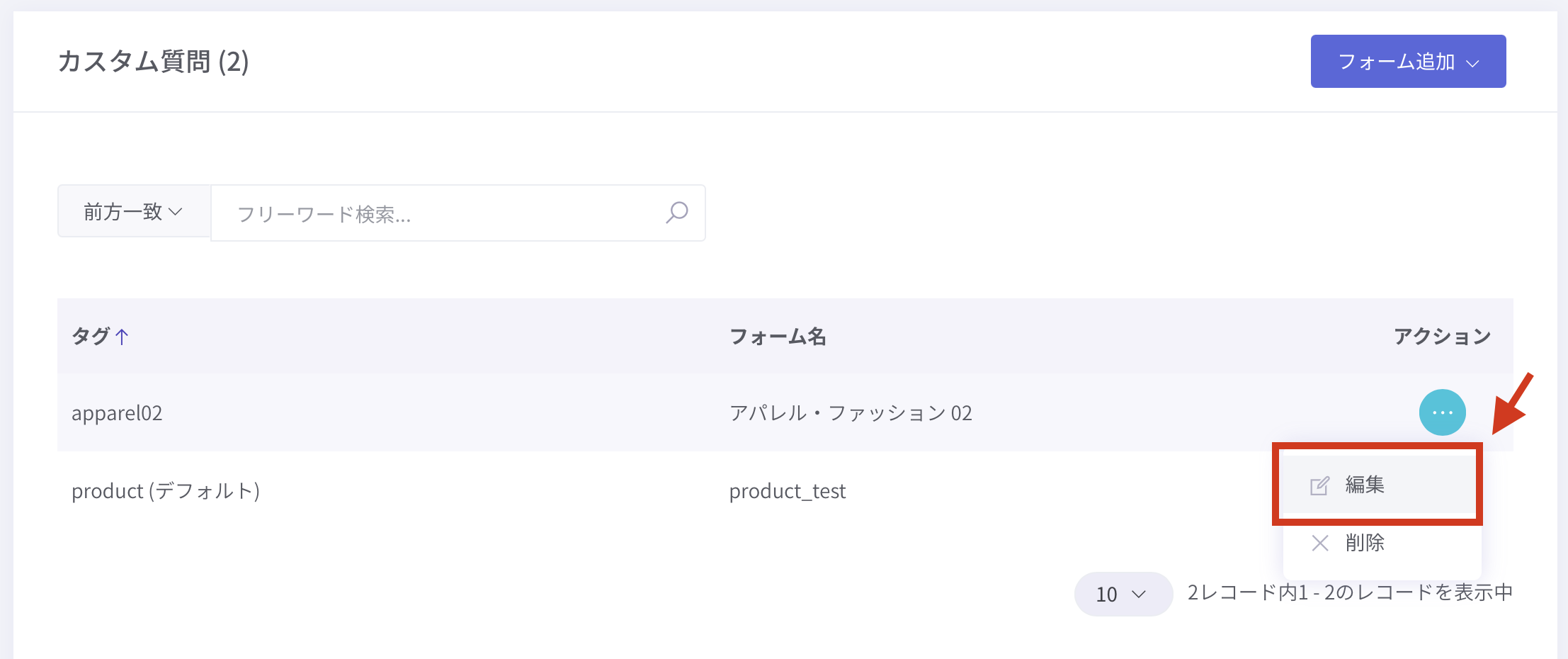 ② カスタム質問管理にフォームが追加されるので、編集したいフォームのアクションボタン(…)を押し、編集 を押します。