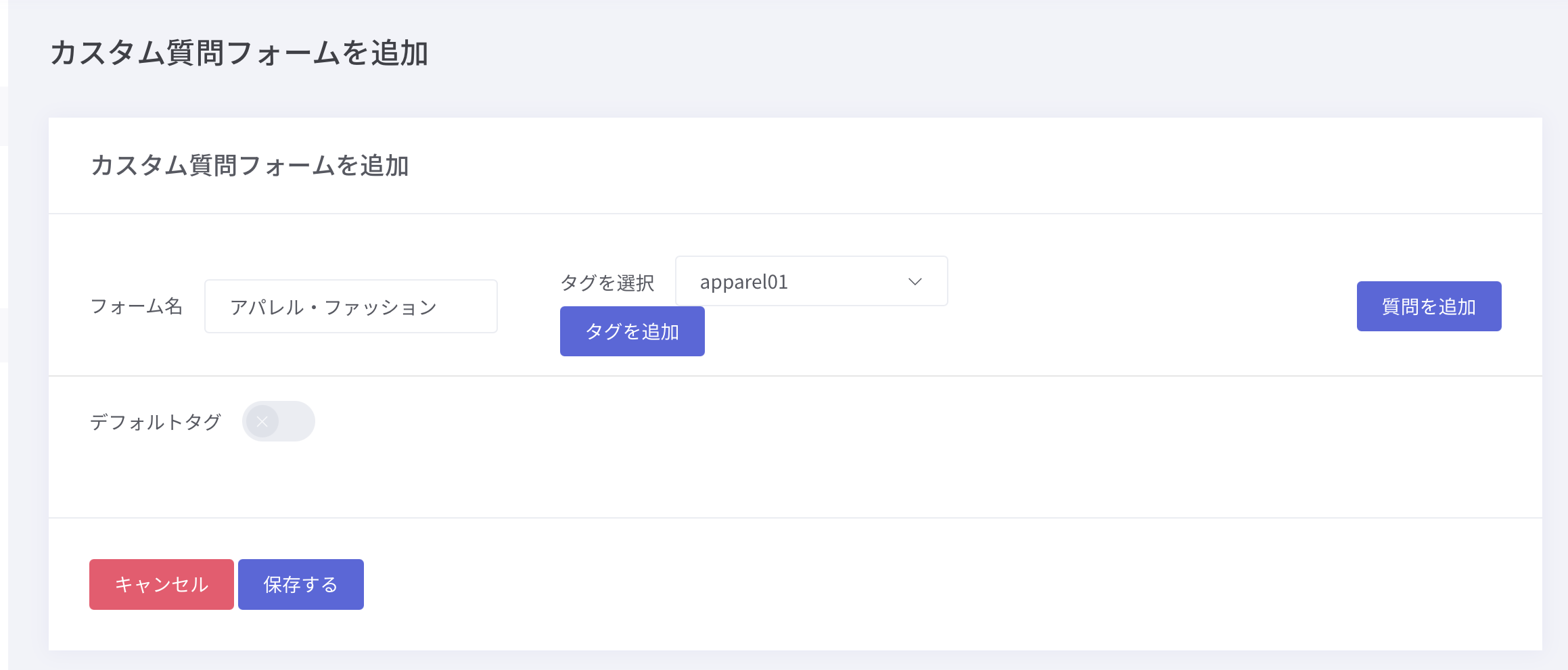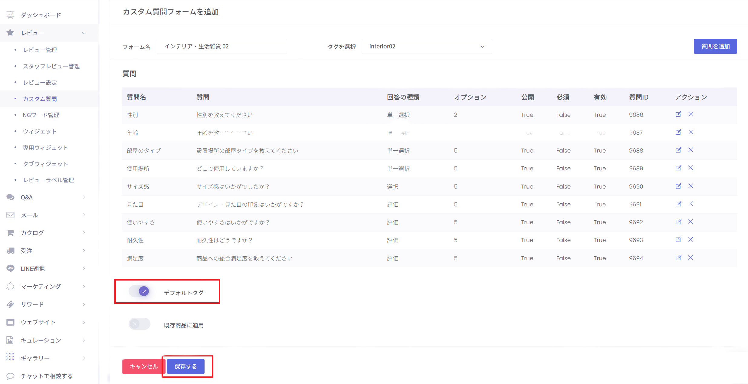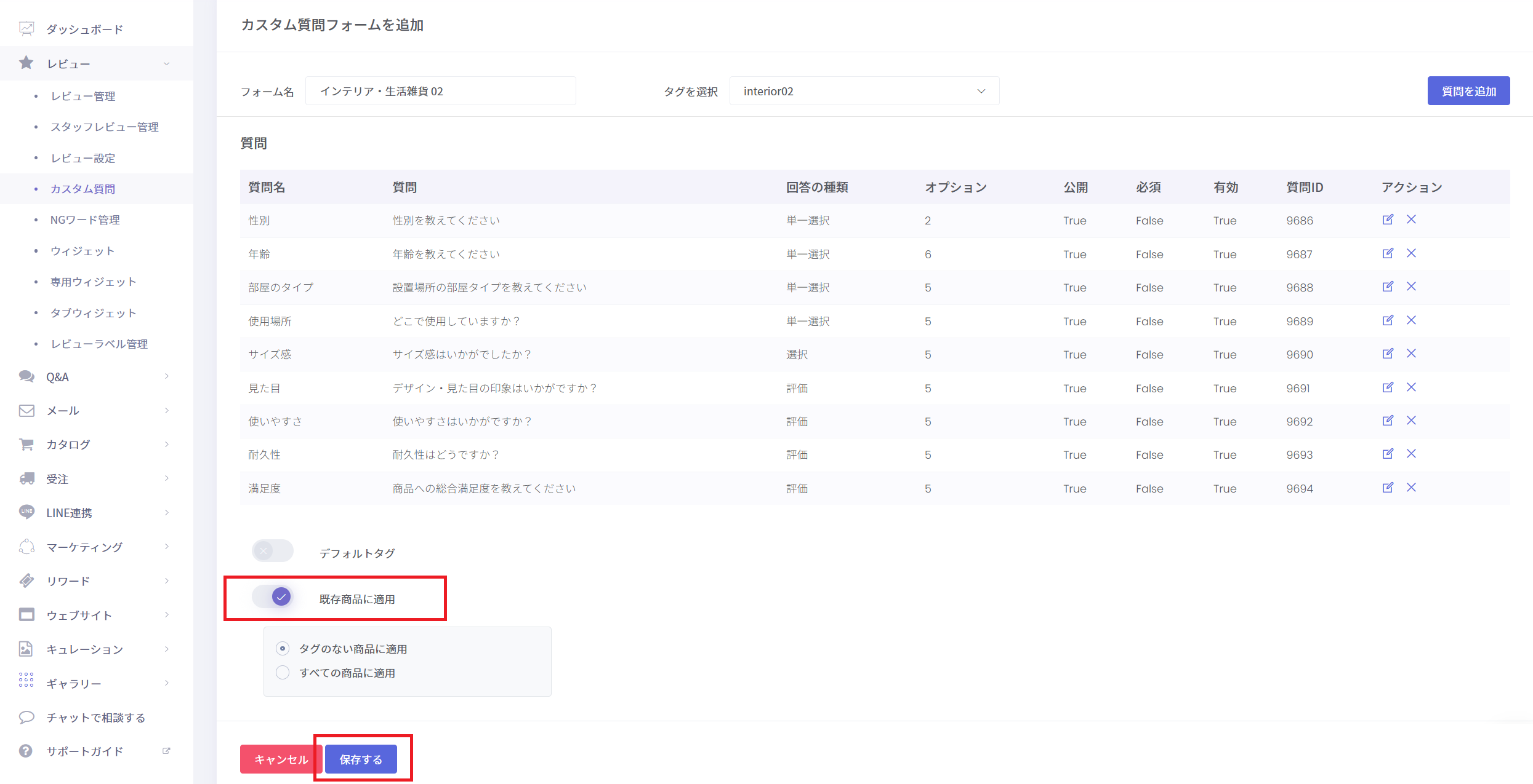 タグ:カスタム質問と紐づけたい商品のタグを選択します。