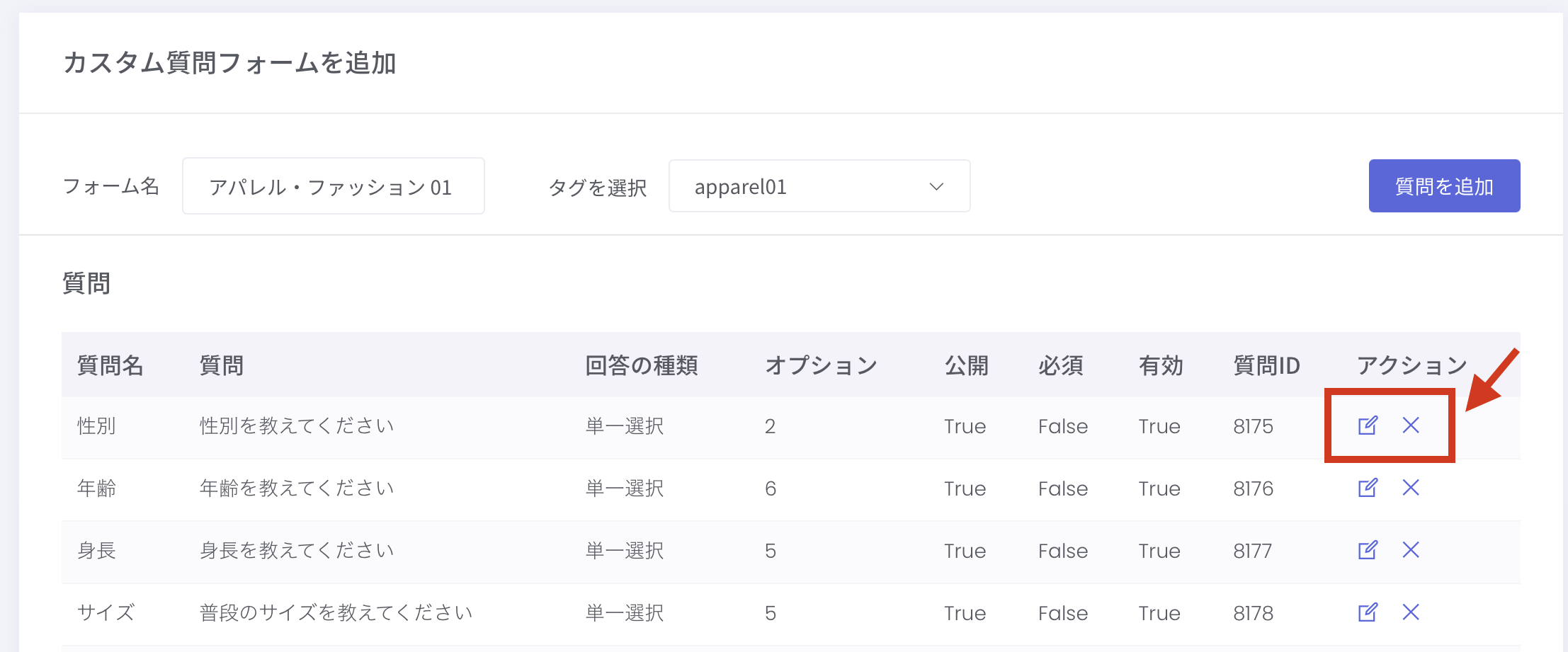 編集したい質問の アクションボタン を押すと編集・削除ができます。