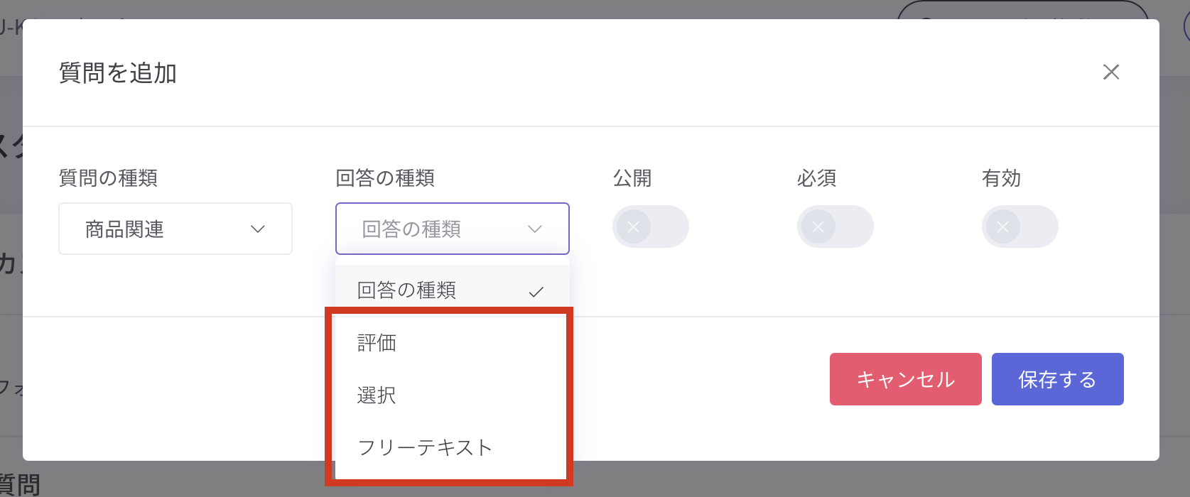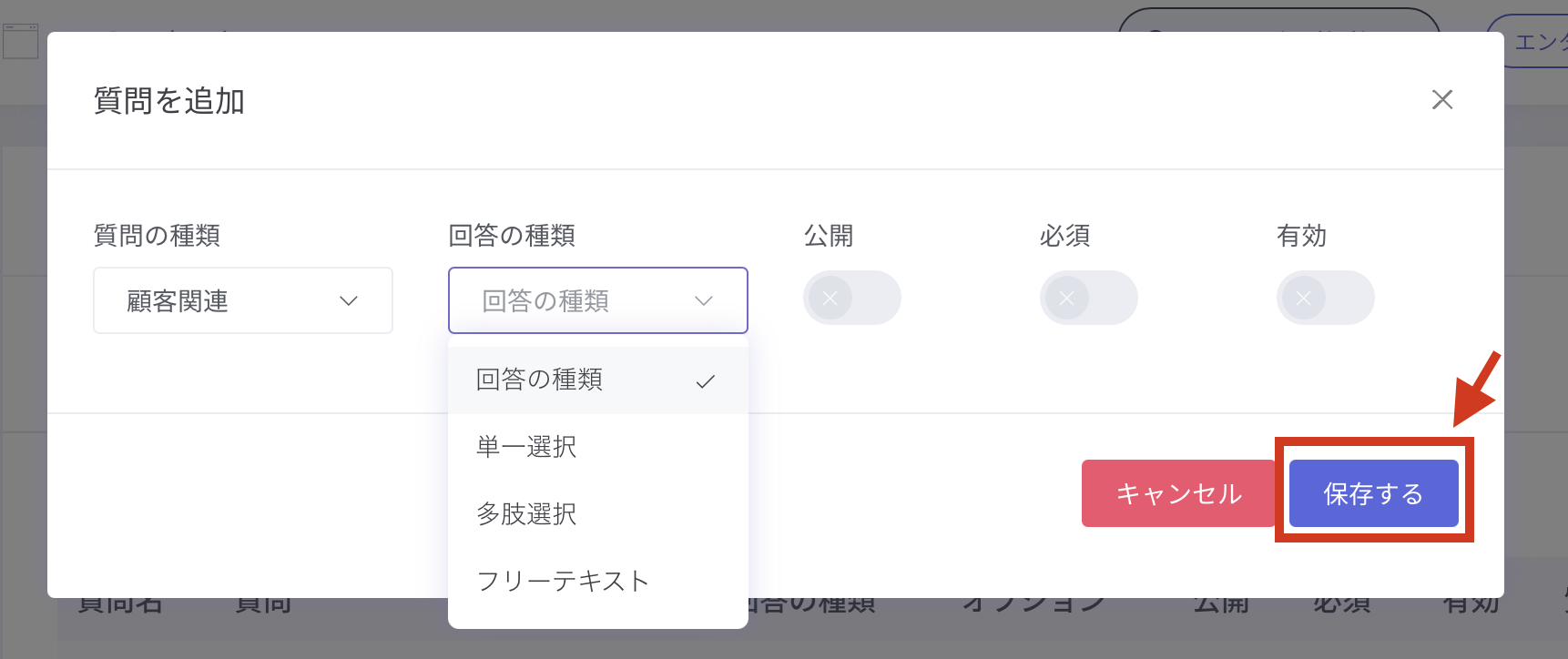 ② 質問の種類・回答の種類などを設定し、保存する を押せば追加完了です。