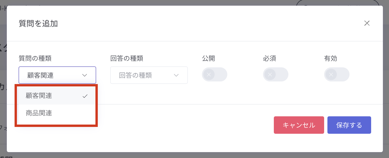 設定できる質問は顧客関連と商品関連の2種類ございます。
