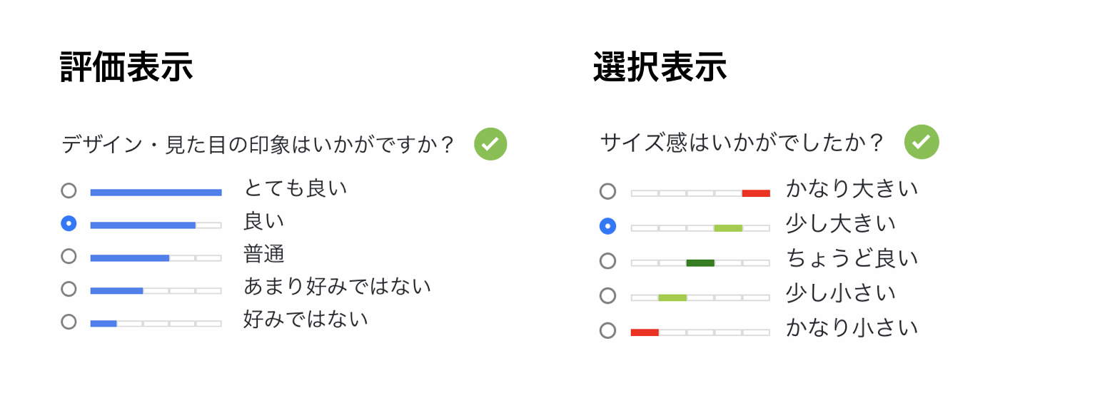 選択:適正・ちょうど良いが中心になる質問(サイズ感・量・服の暑さ など)