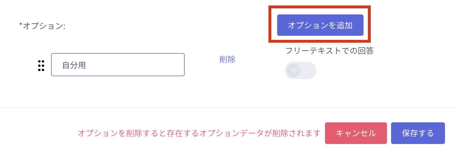 オプションを追加 を押すと入力欄が表示されますので、選択肢を入力し 保存する を押せば選択肢を追加できます。