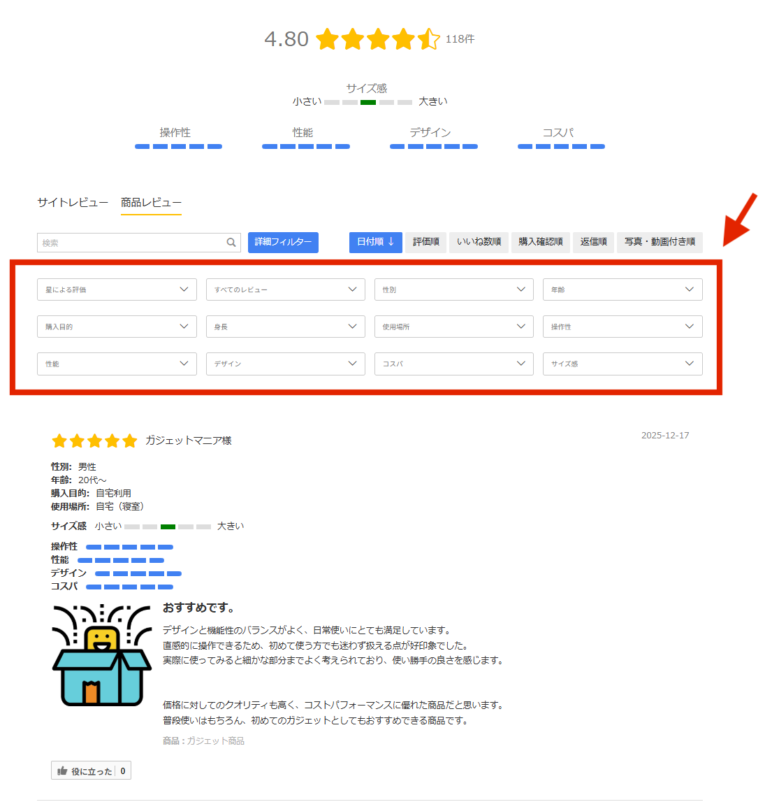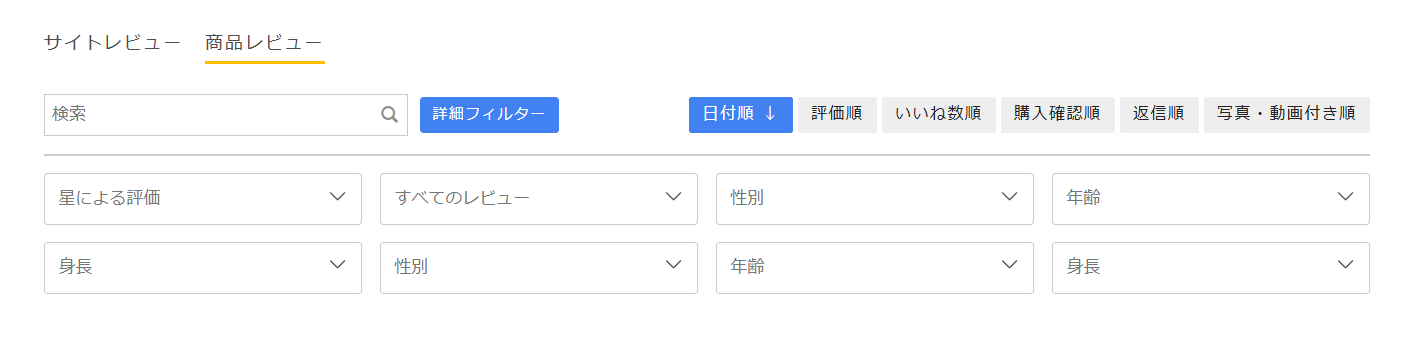 フィルター名:お客さまがレビューをソートする際に使用する名前です。
