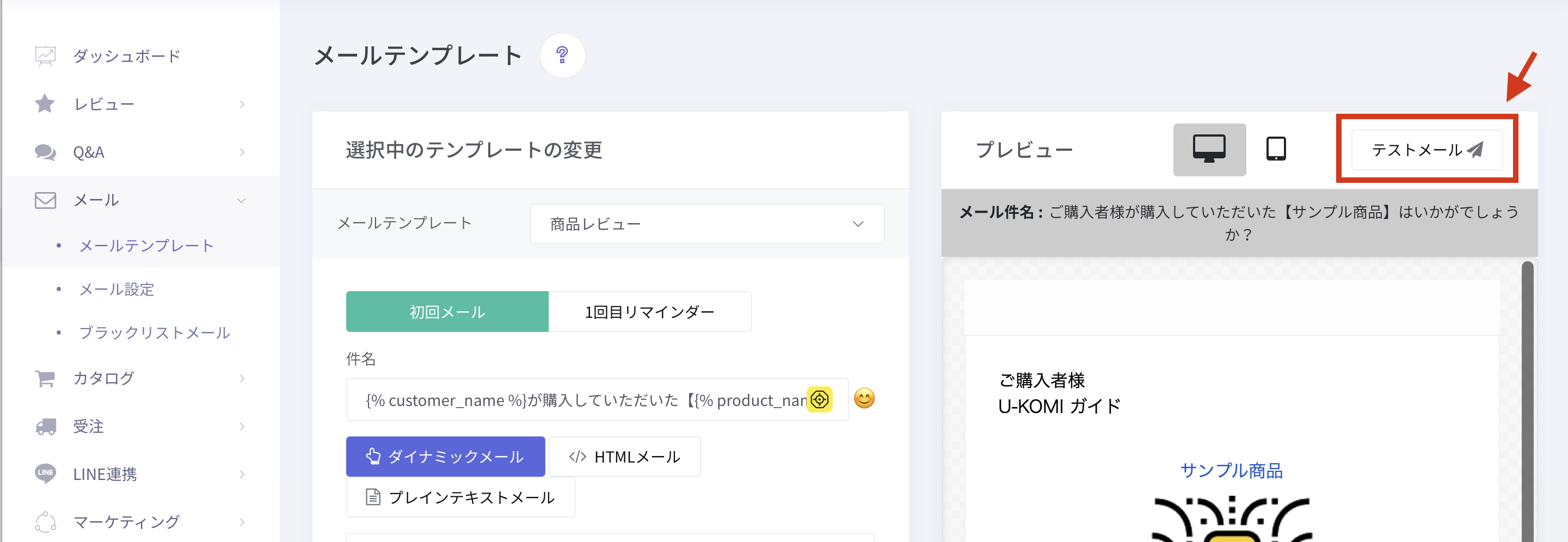 ①「メール > メールテンプレート」より、テストメール を押します。