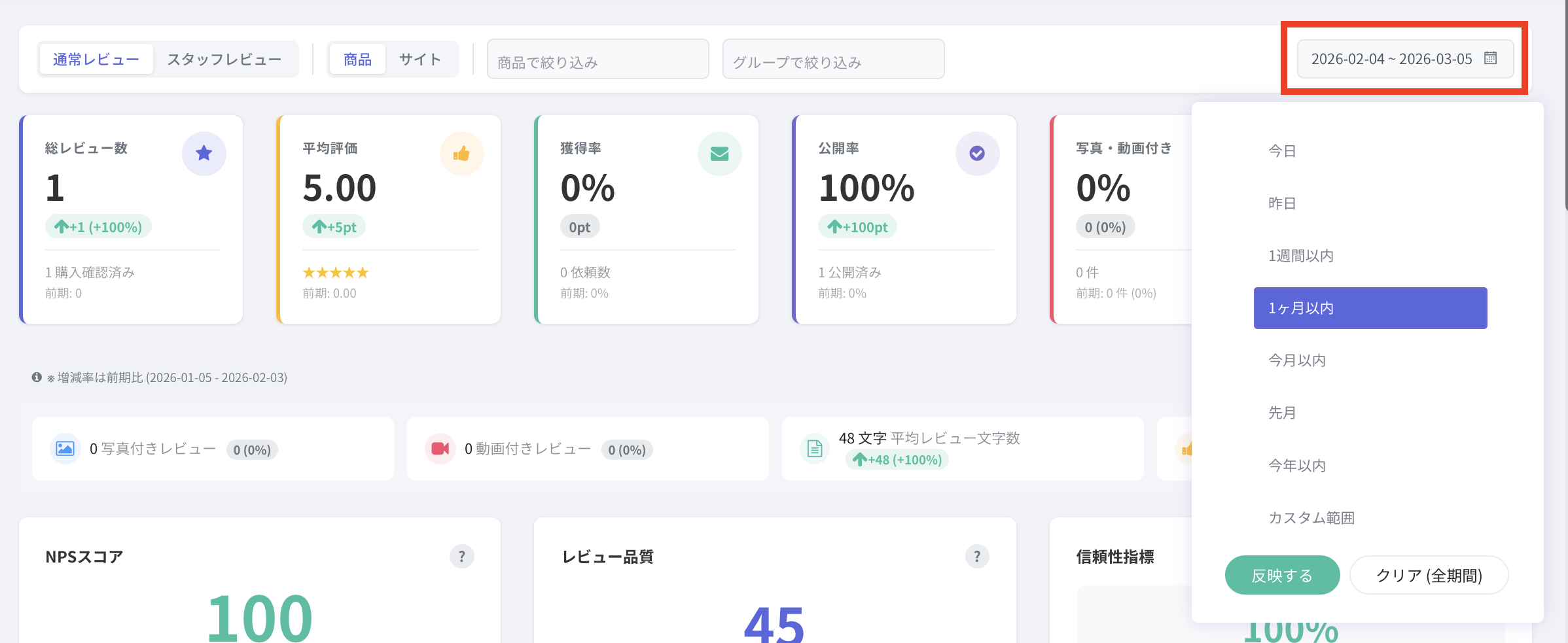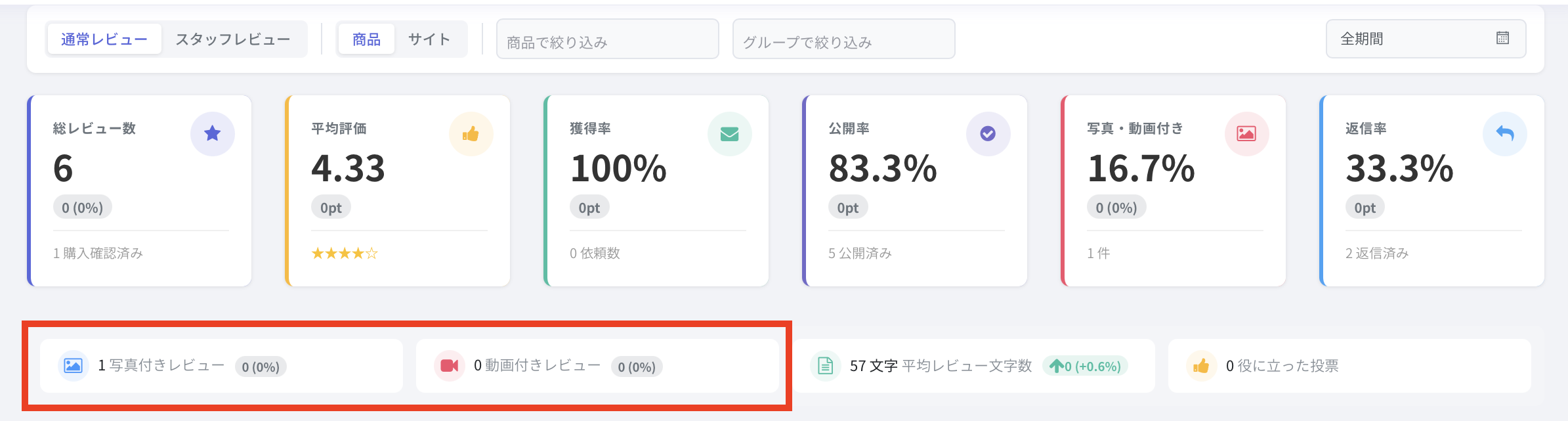 指定した期間に投稿されたレビューのうち、写真もしくは動画付きで投稿されたレビューの割合が表示されます。