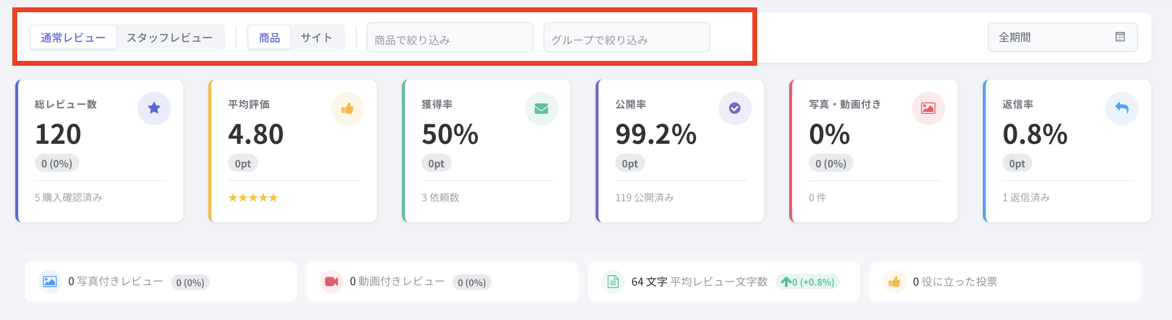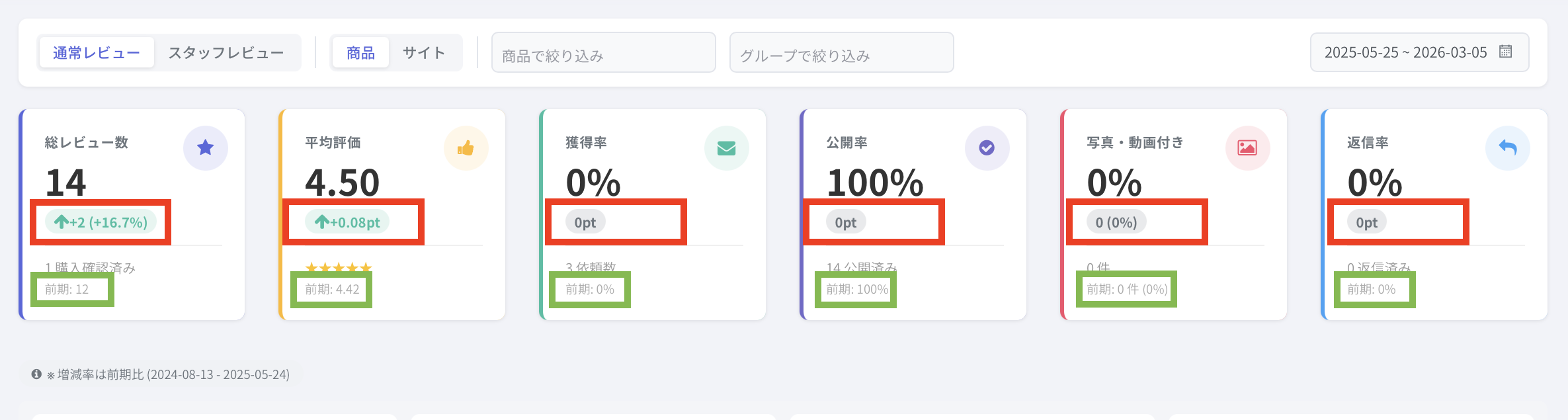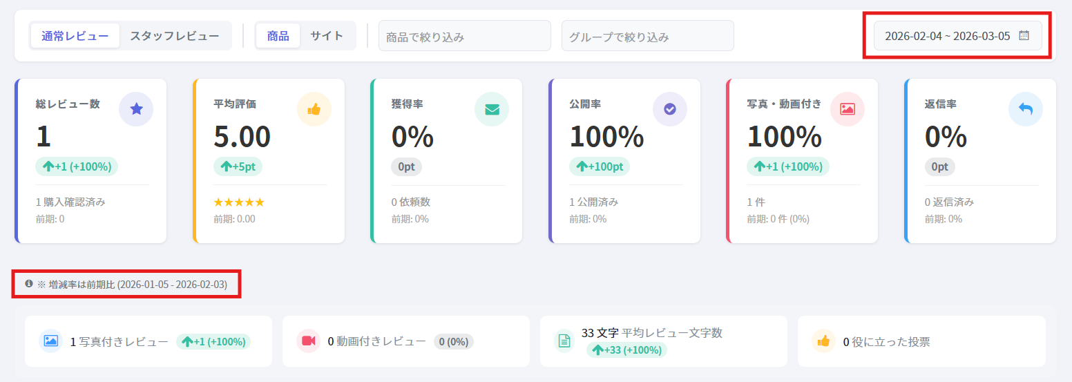 その総数のうち、購入確認済みのレビュー数が前期比の下に表示されます。