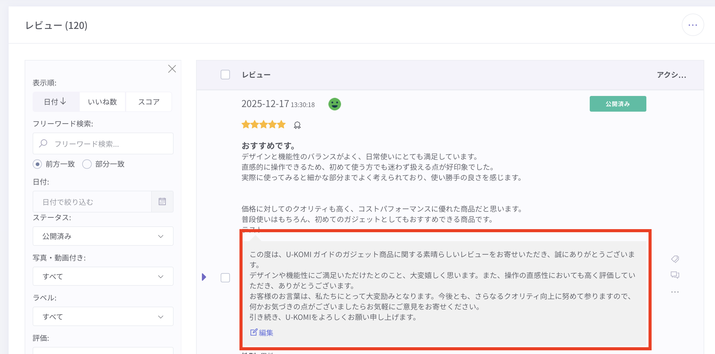 このガイドでは、U-KOMIで獲得したレビューの解析データ(レビュー解析)について説明しています。