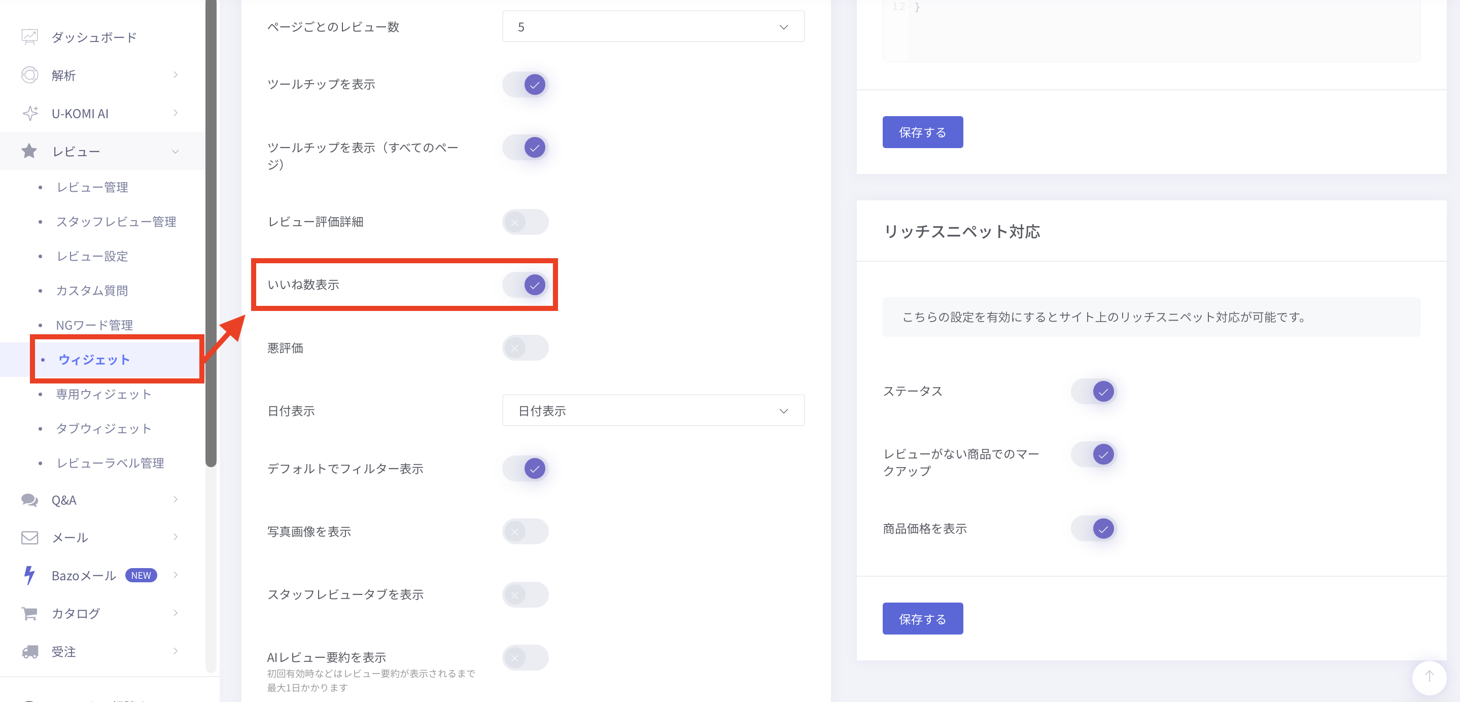 こちらは、「レビュー > ウィジェット > ウィジェット設定 」より、「 いいね数表示 」を有効 ☑️ にする必要があります。
