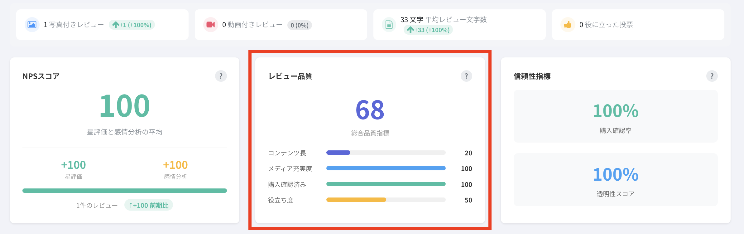 4つの要素に基づいて、レビューの総合品質を測定するスコア(0〜100)です。