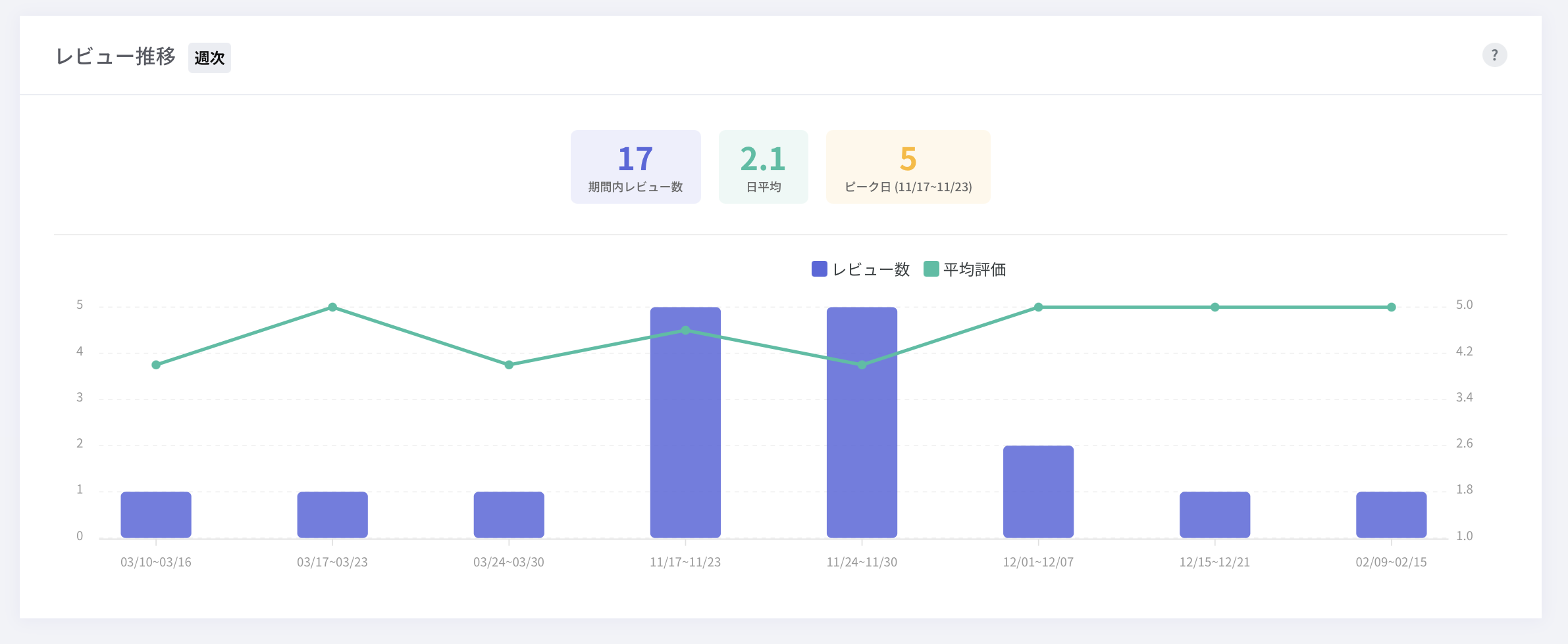 指定した期間に投稿されたレビュー数や平均評価の推移を表示しています。
