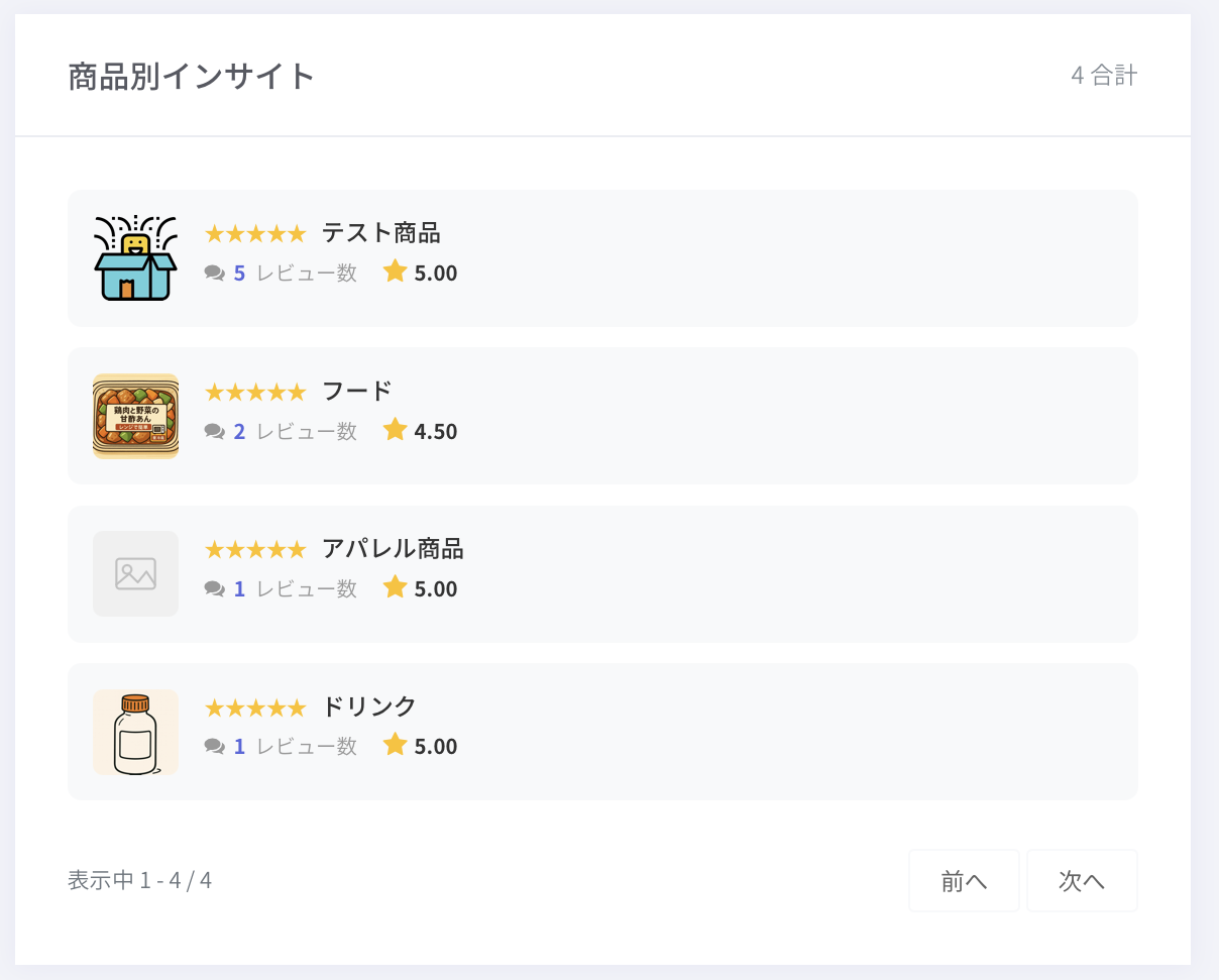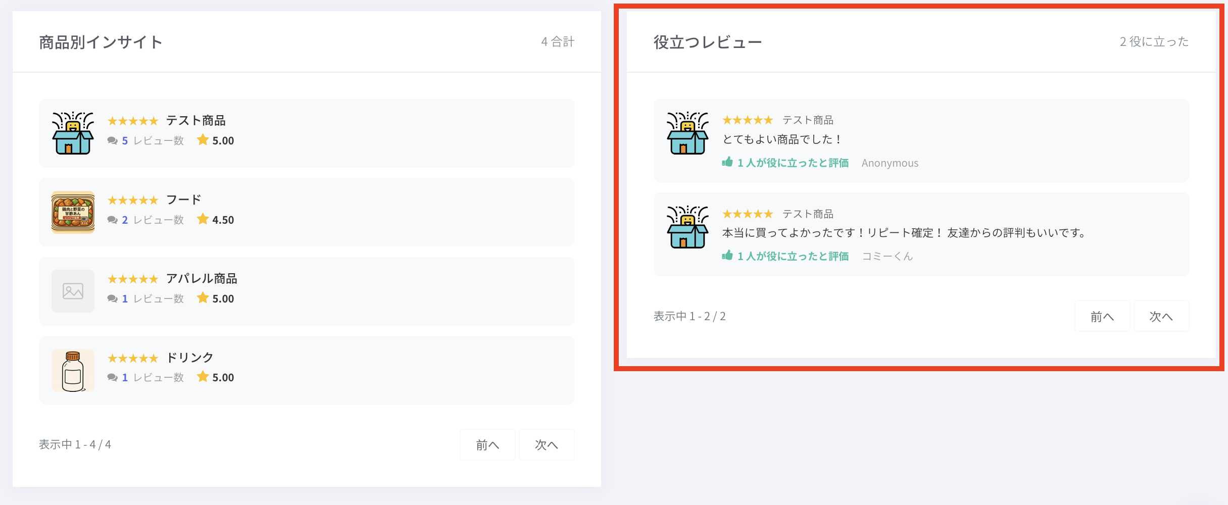 スタッフレビュー:スタッフが投稿したレビュー(エンタープライズプランのみ)商品:商品に対するレビュー