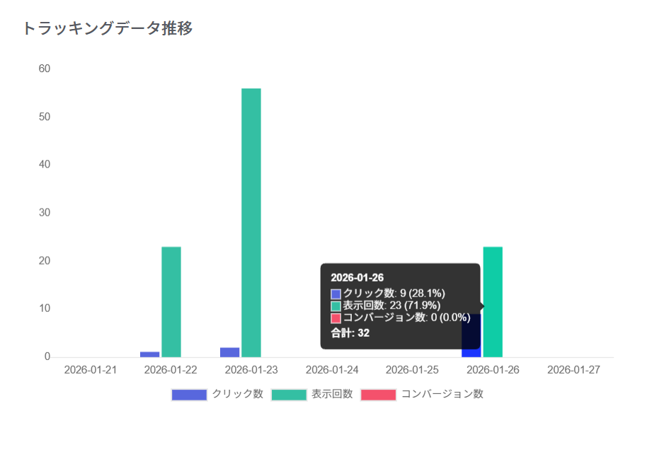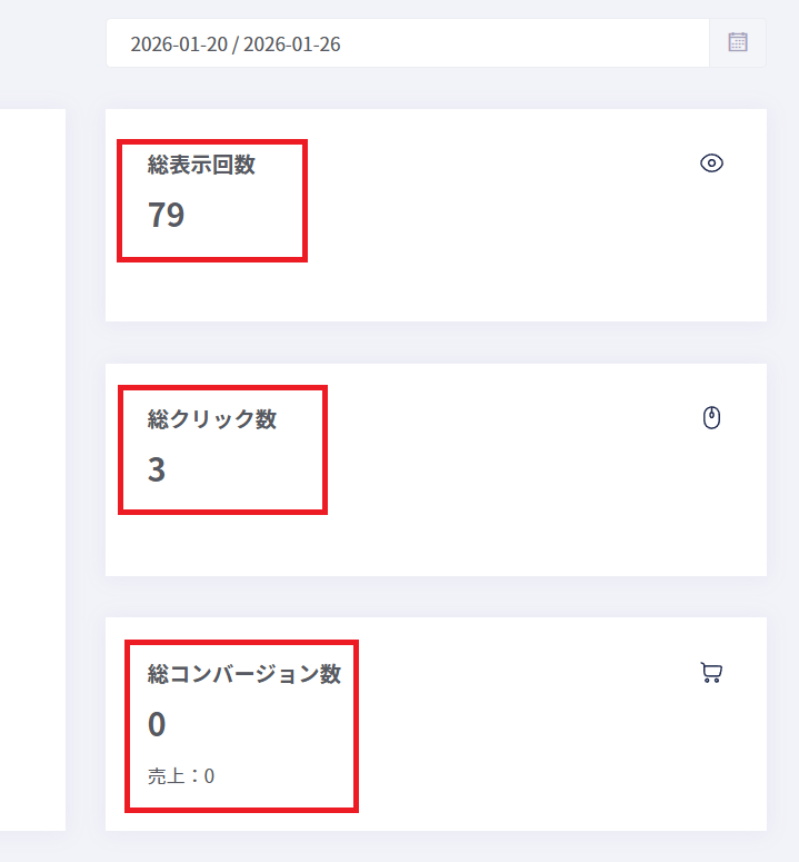 指定した期間内のデータが、表示回数・クリック数・コンバージョン数として集計されます。