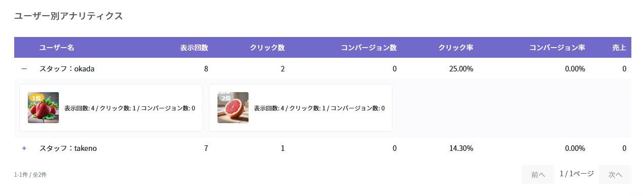 画面右側には、期間内の成果をまとめた分析結果が表示されます。